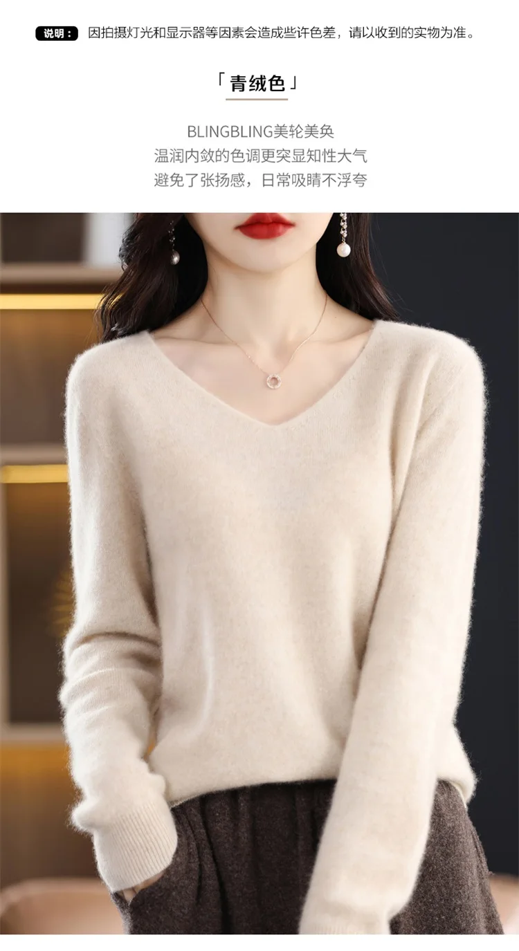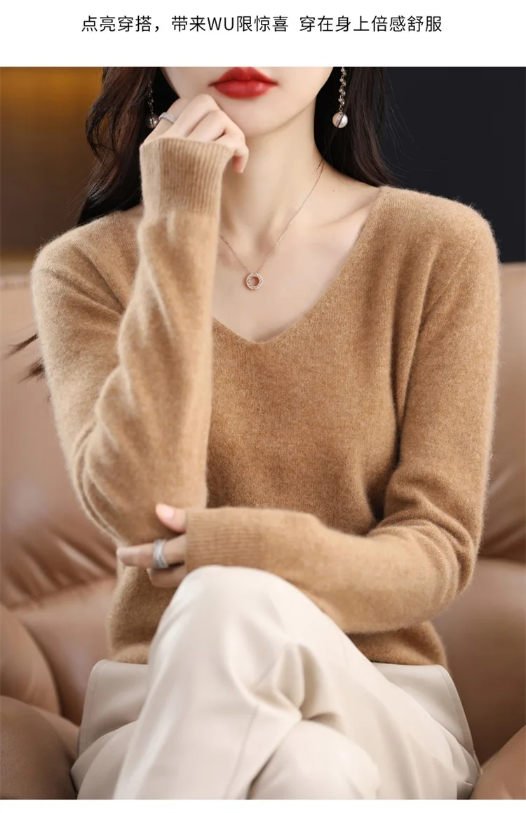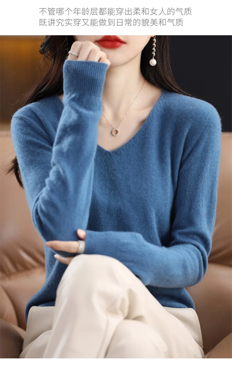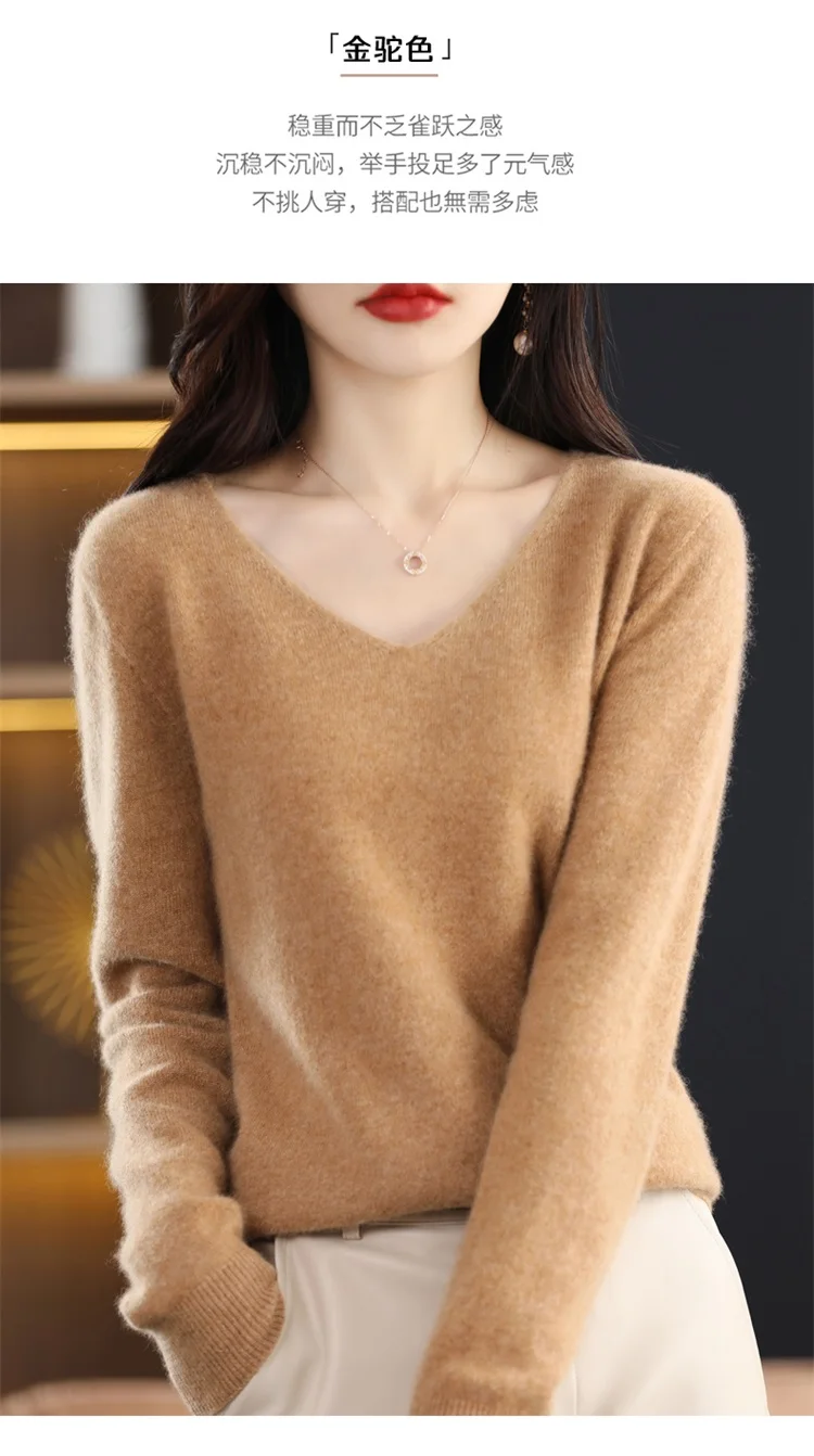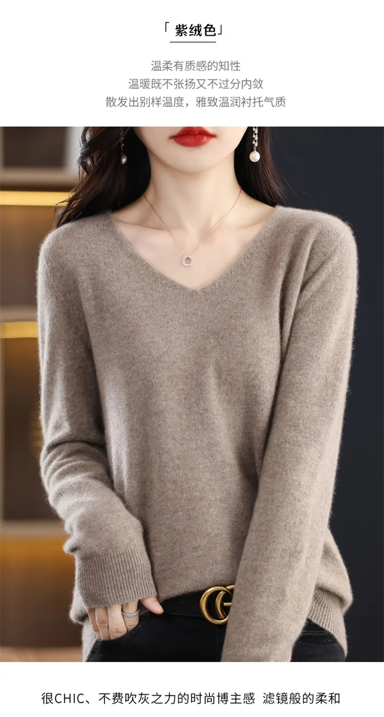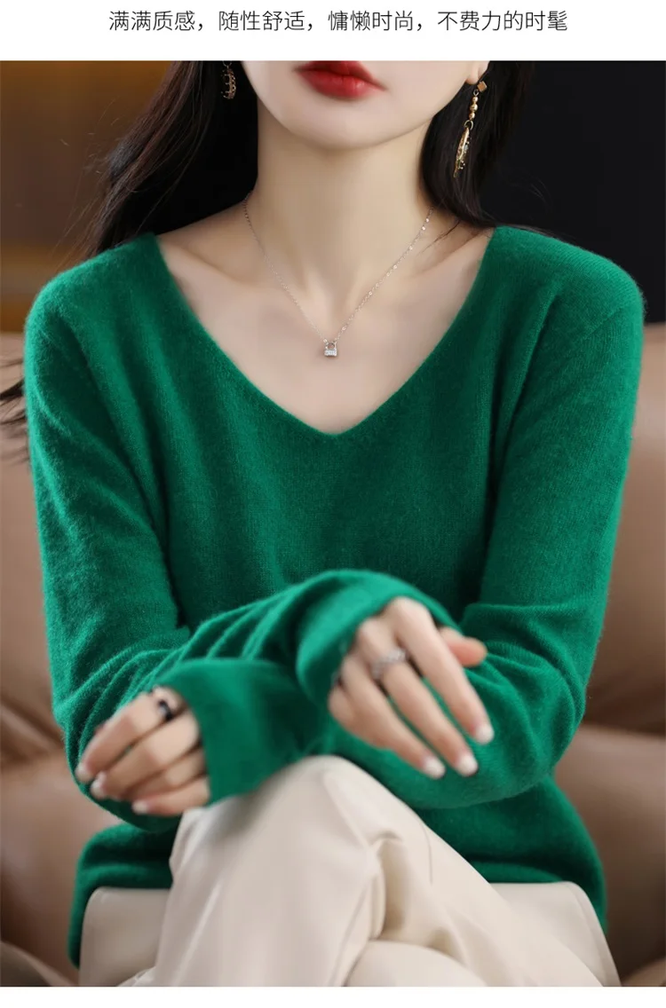 Autumn and winter new women’s first-line ready-to-wear 100% pure wool V-neck solid color loose warm cashmere pullover top
