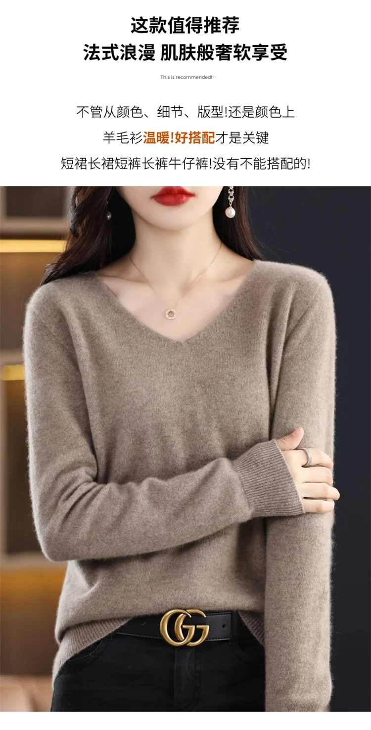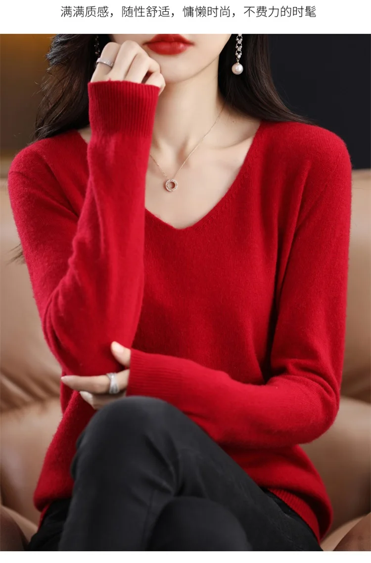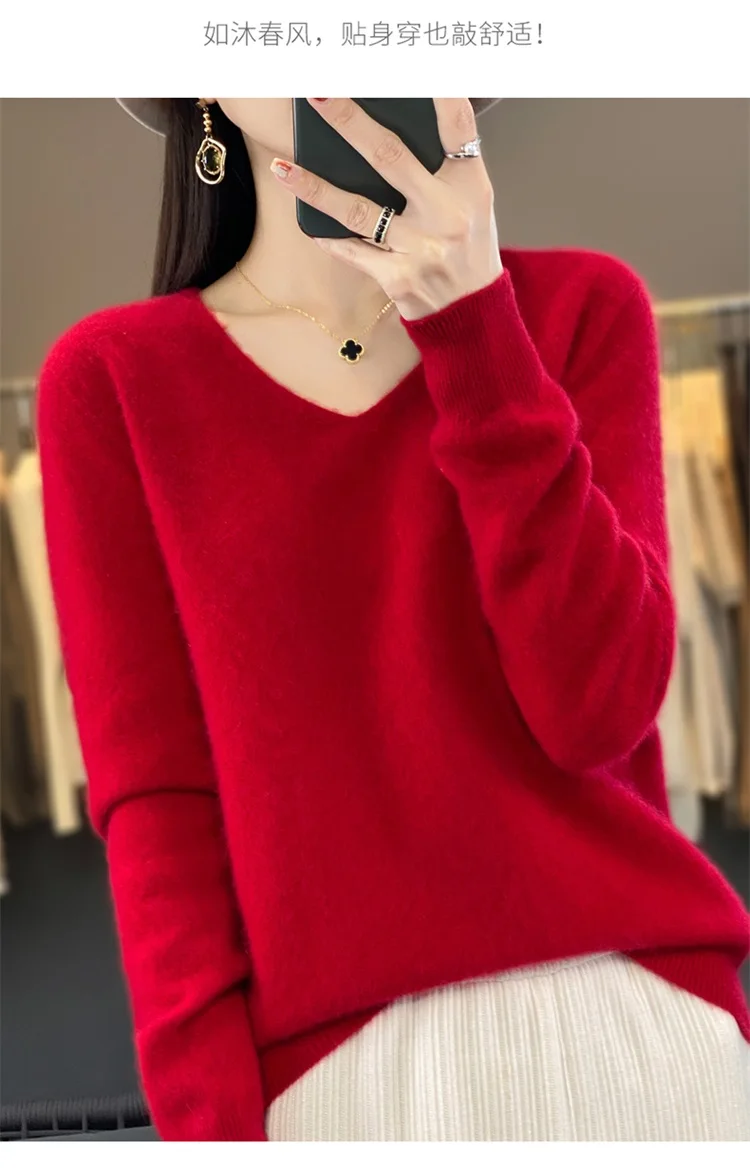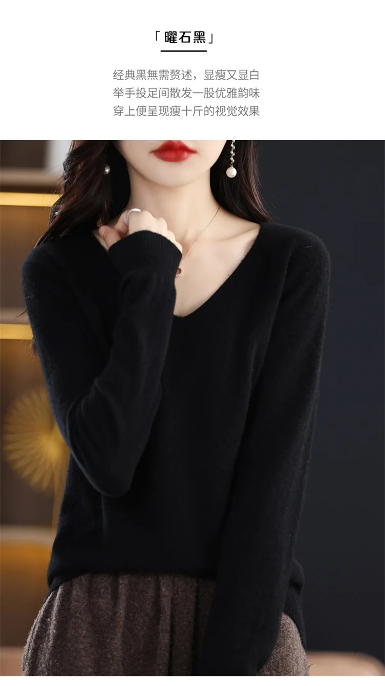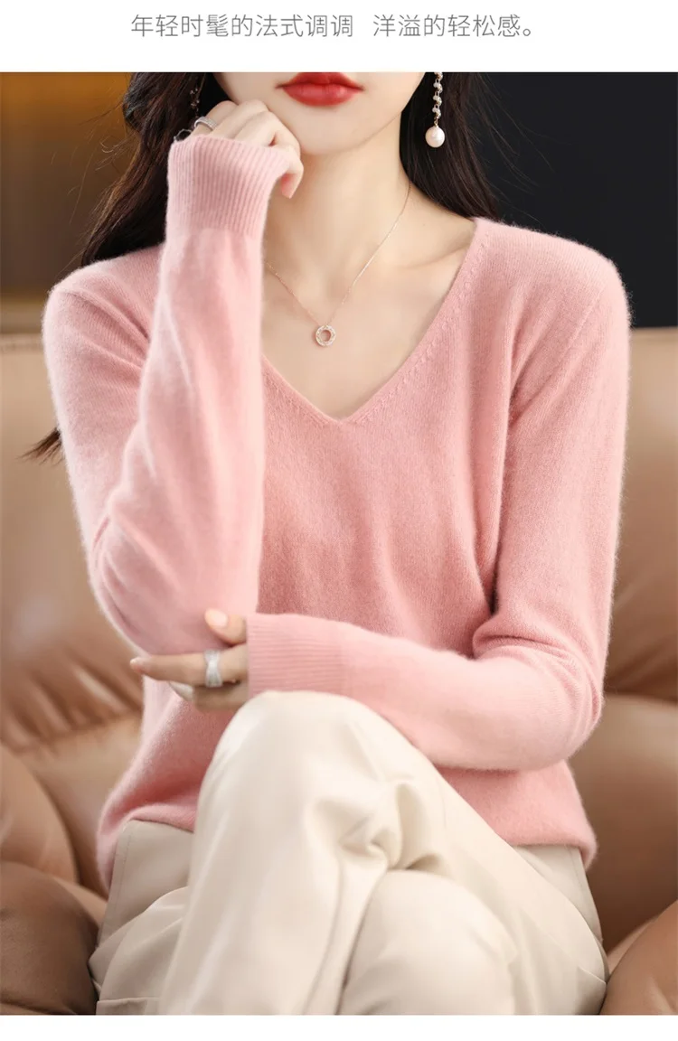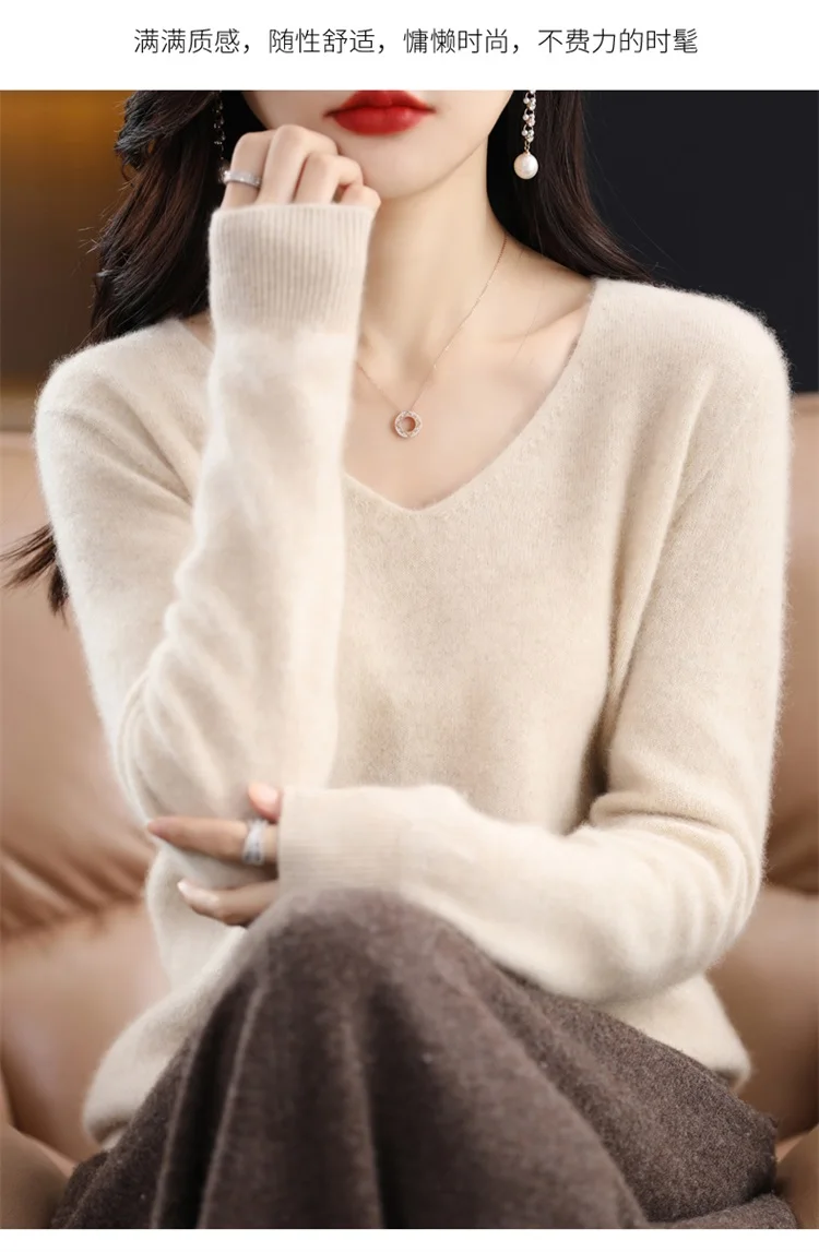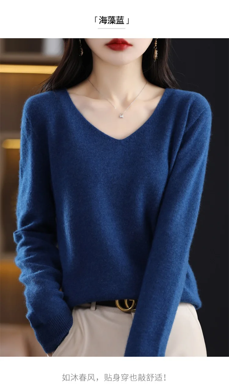 Autumn and winter new women’s first-line ready-to-wear 100% pure wool V-neck solid color loose warm cashmere pullover top