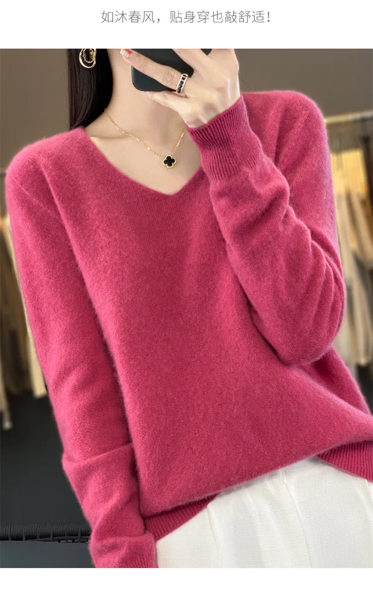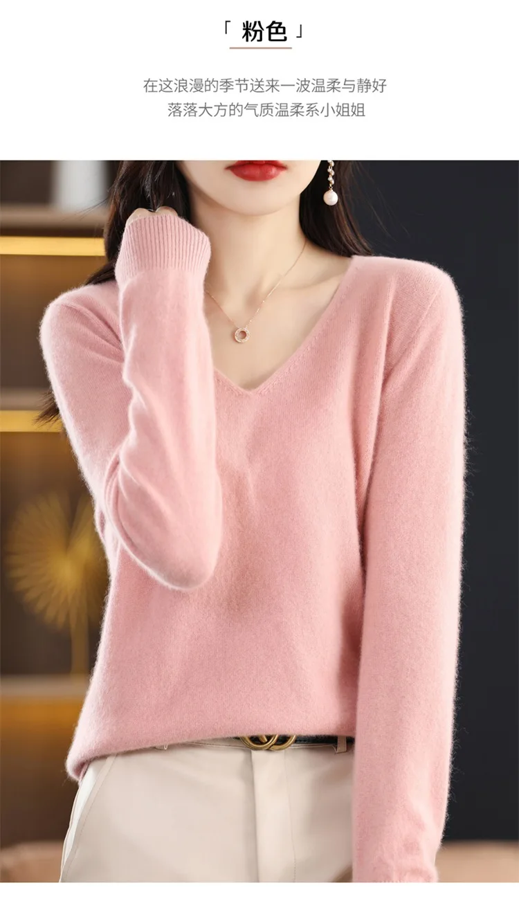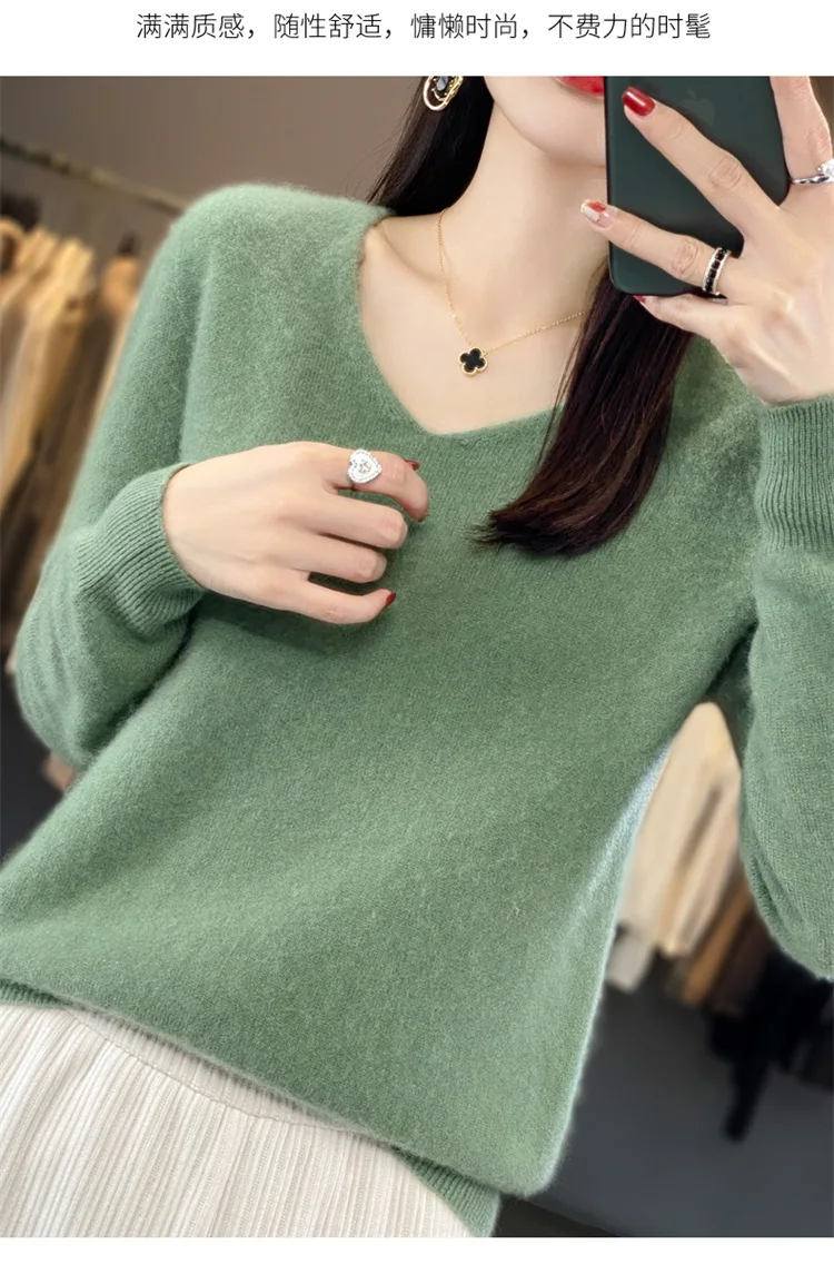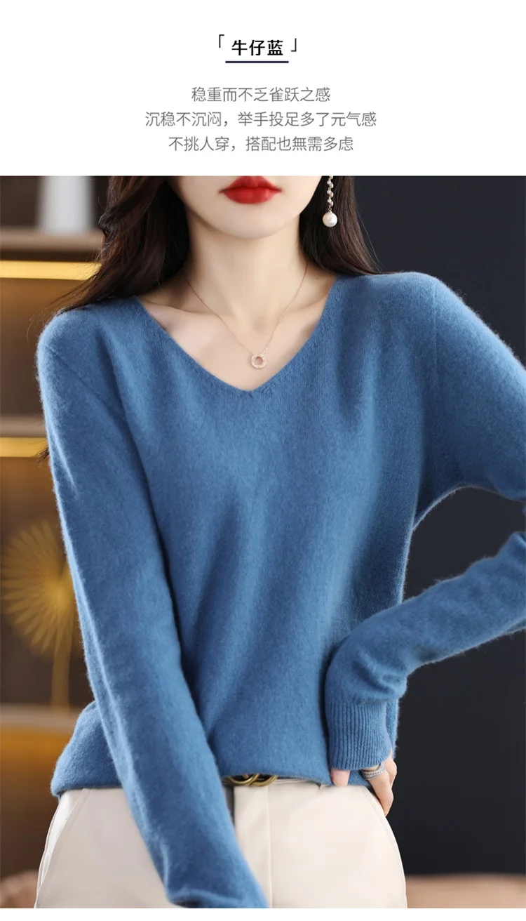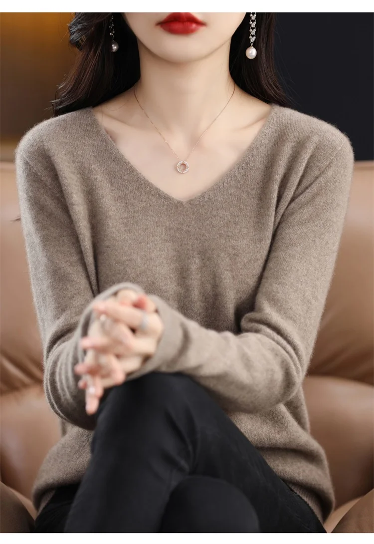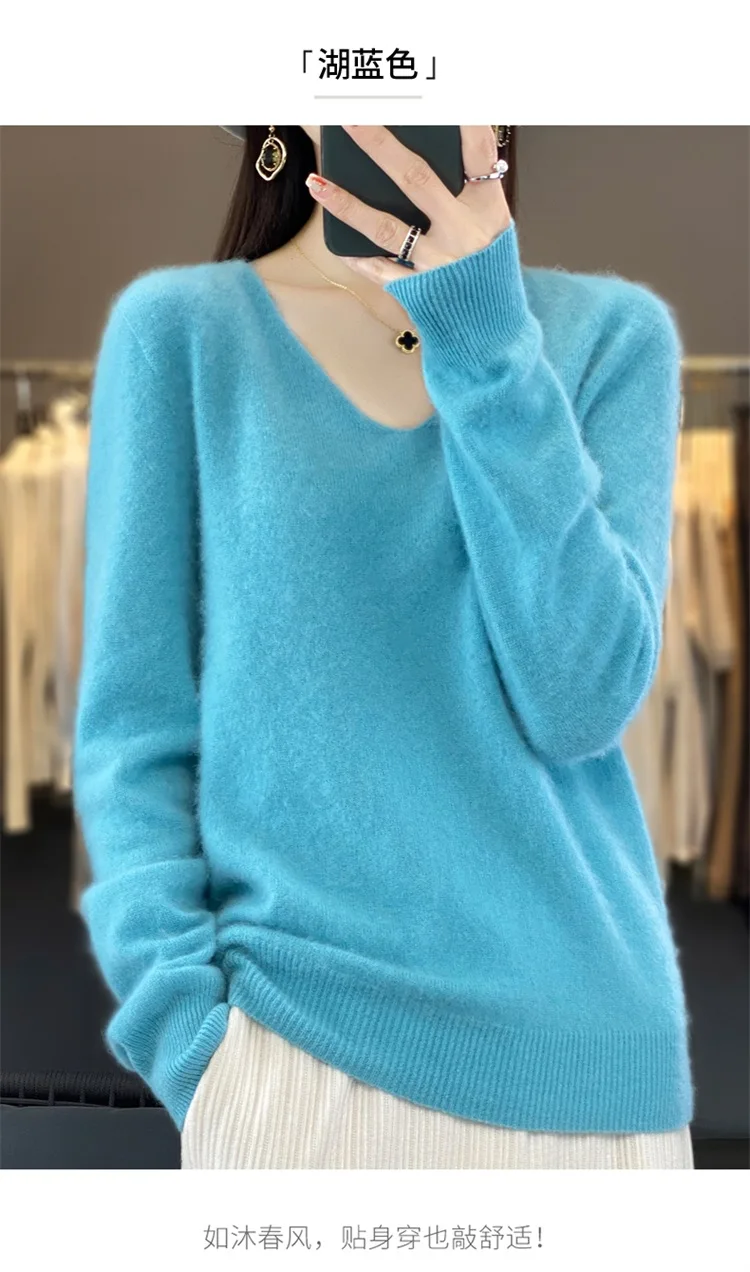 Autumn and winter new women’s first-line ready-to-wear 100% pure wool V-neck solid color loose warm cashmere pullover top