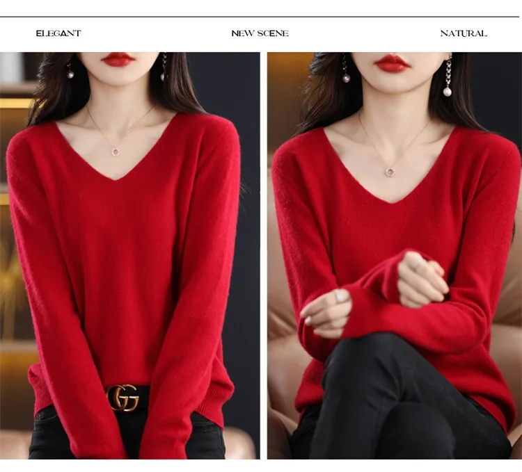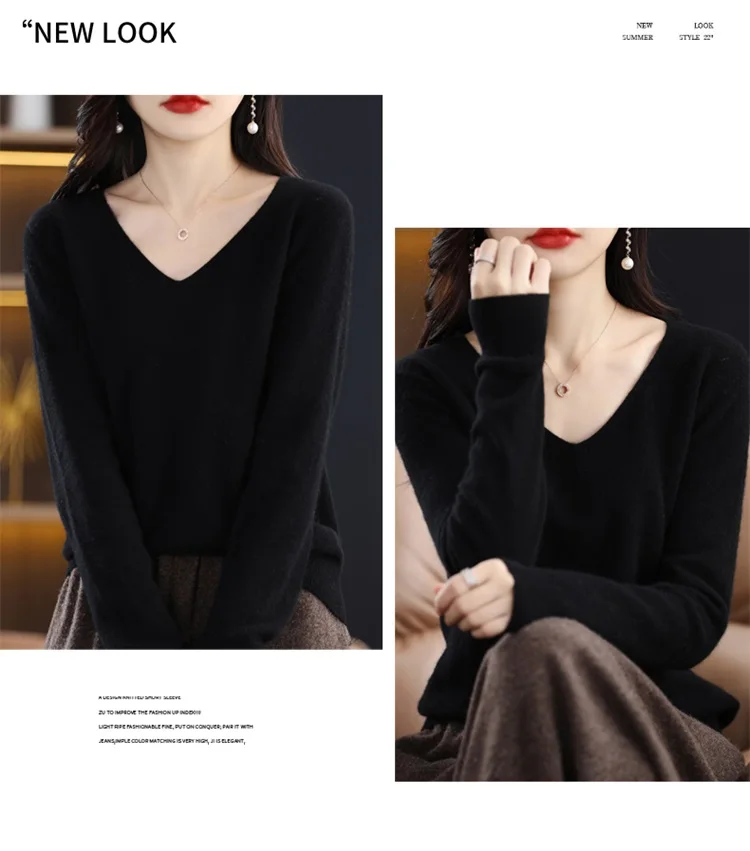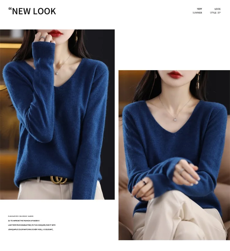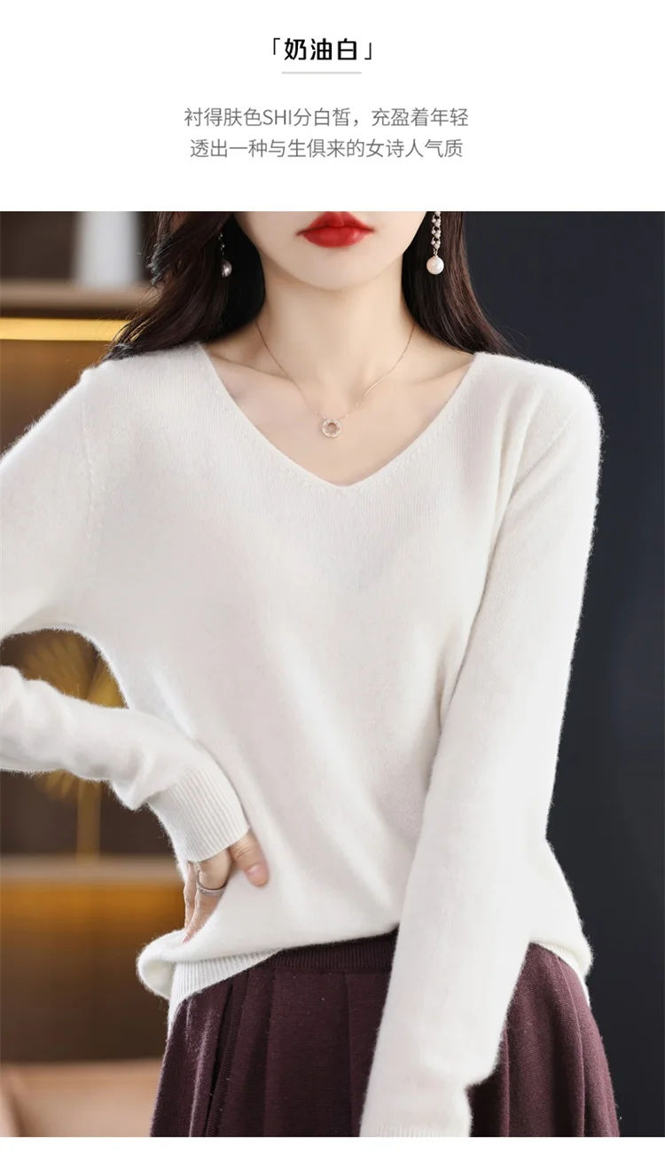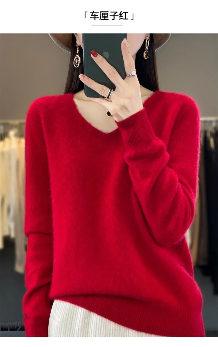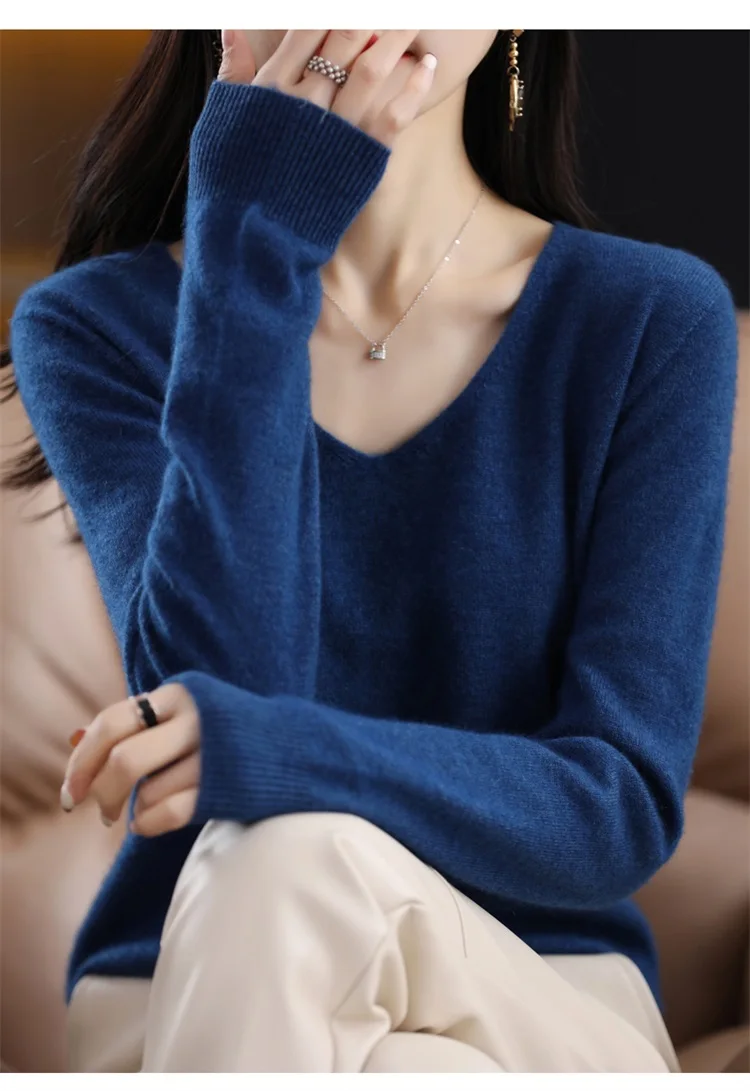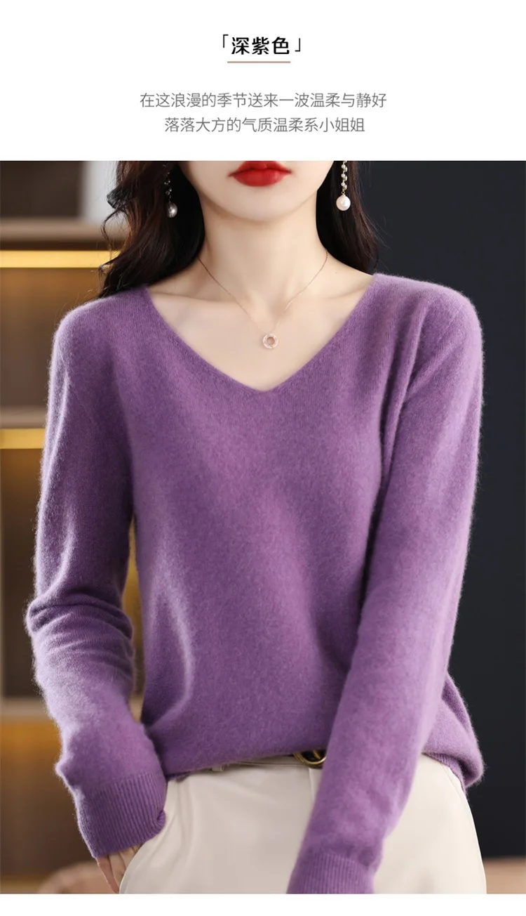 Autumn and winter new women’s first-line ready-to-wear 100% pure wool V-neck solid color loose warm cashmere pullover top