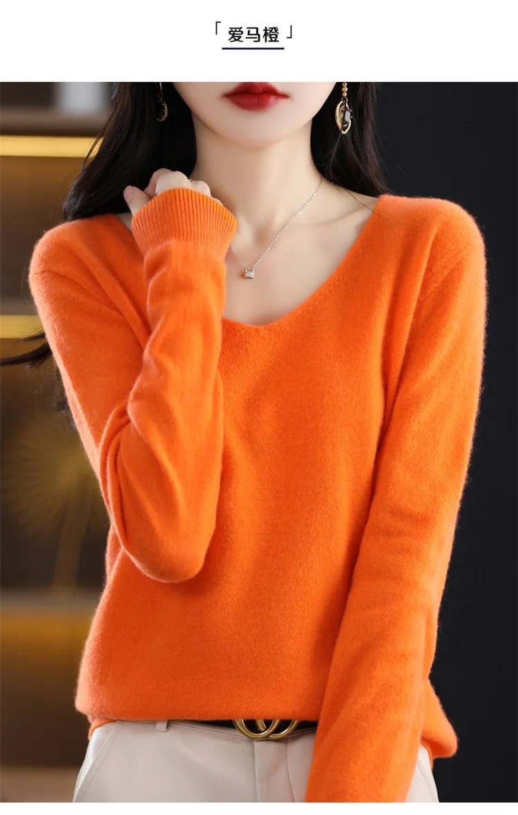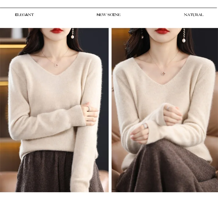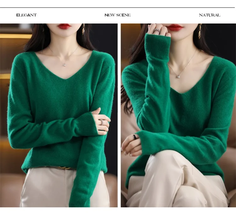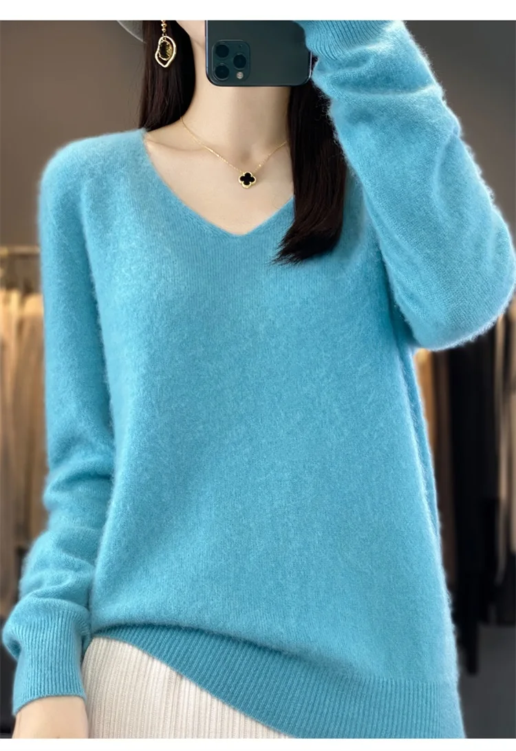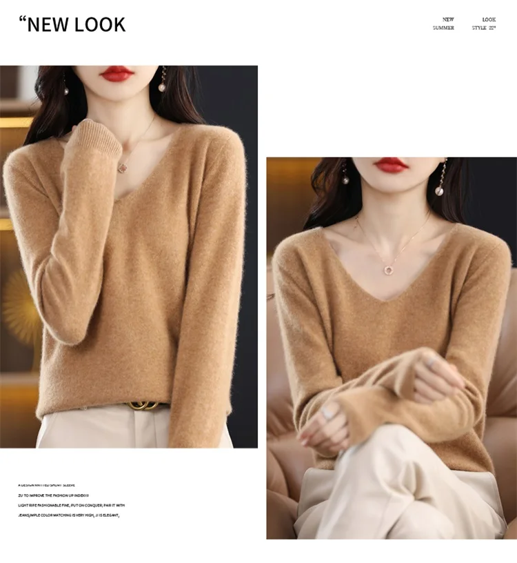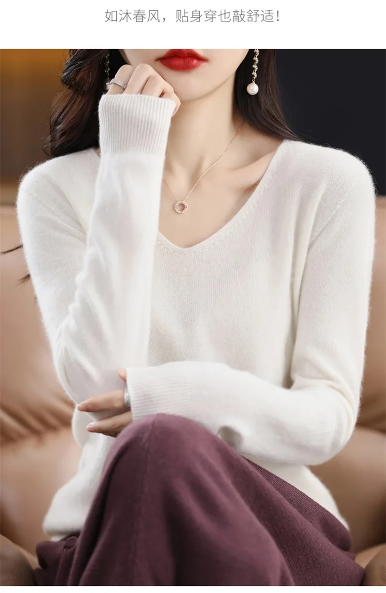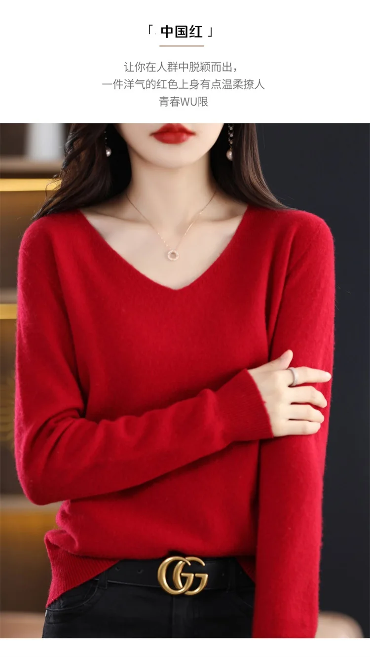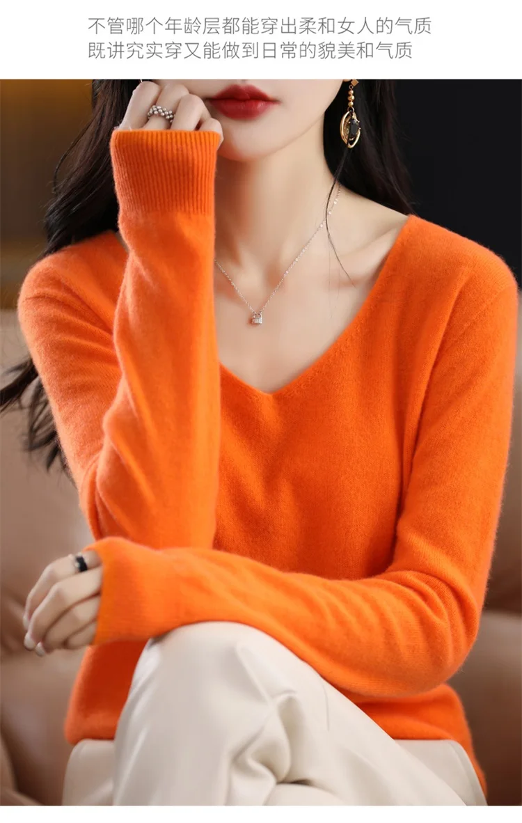 Autumn and winter new women’s first-line ready-to-wear 100% pure wool V-neck solid color loose warm cashmere pullover top