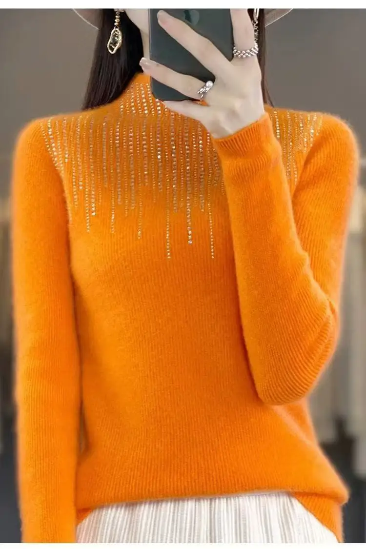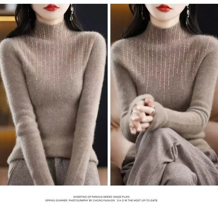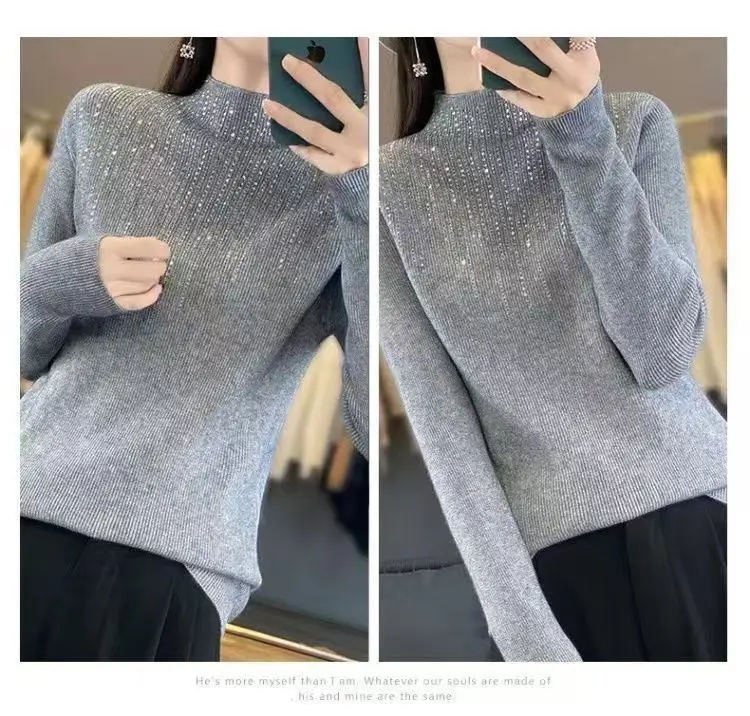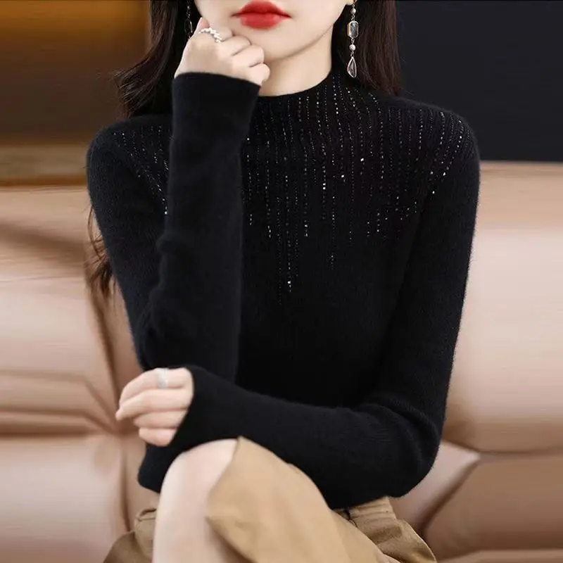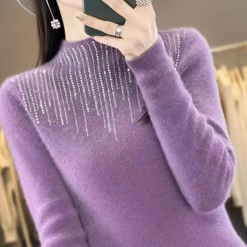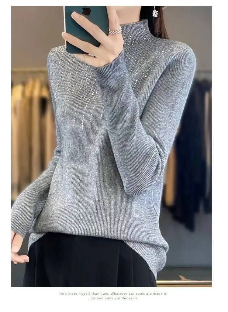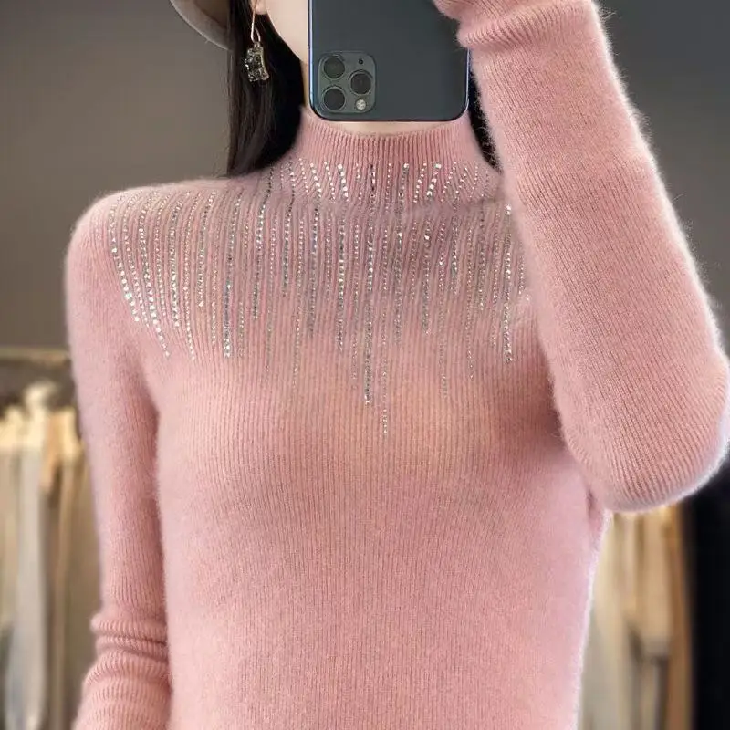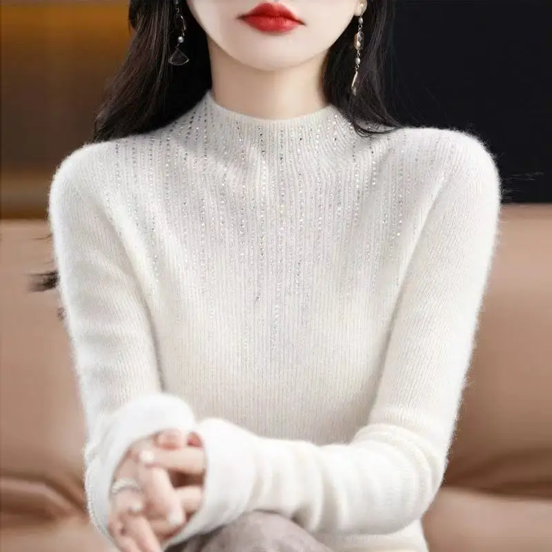 Fall/WinterMerino Wool Semi-high Collar Women Diamond Pullover Korean Fashion Soft Warm Sweater Solid Color Sweater Women’s Wear