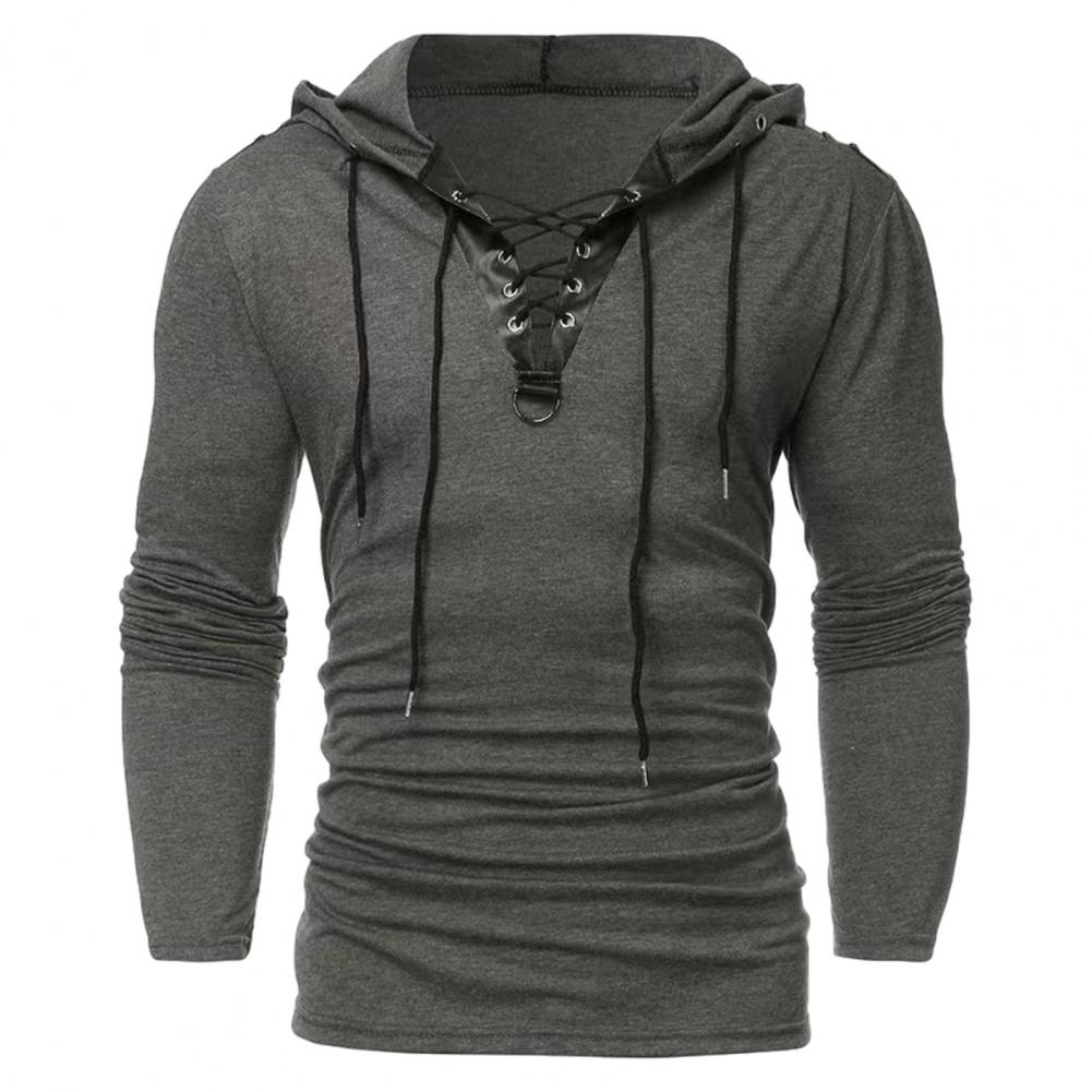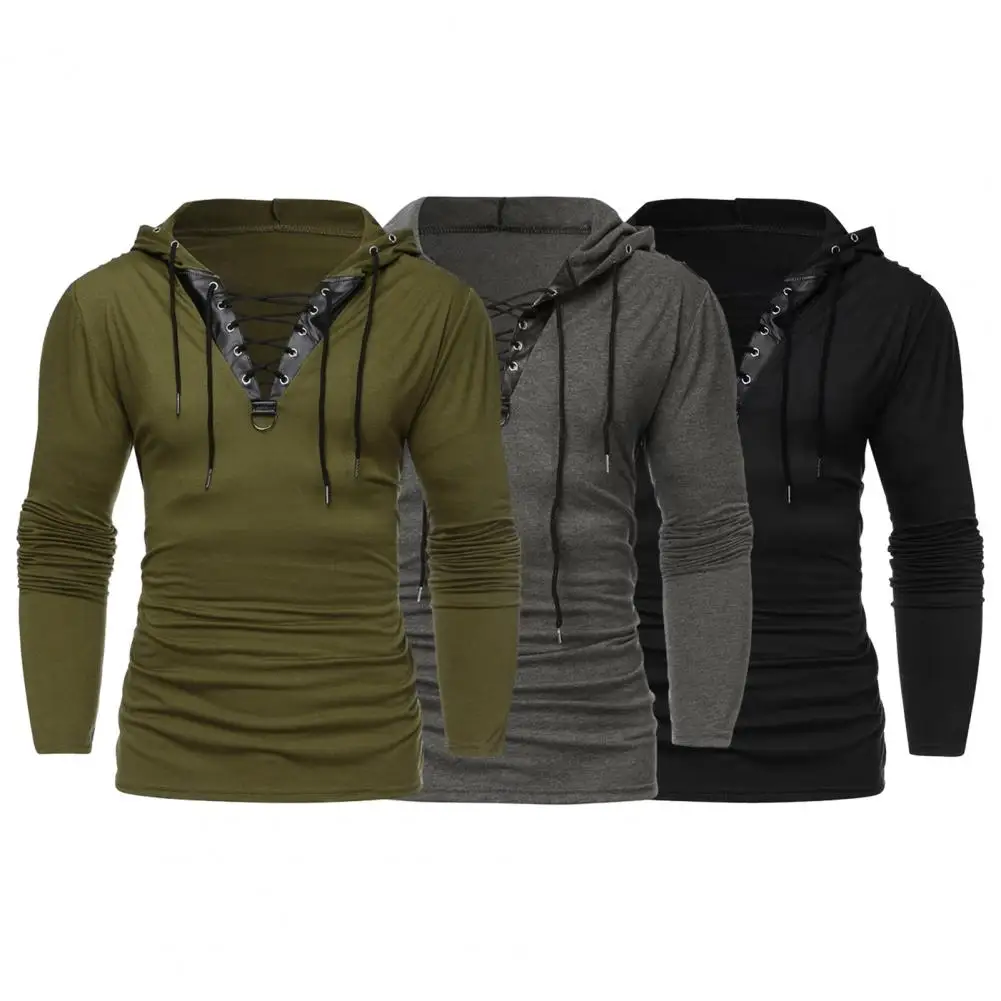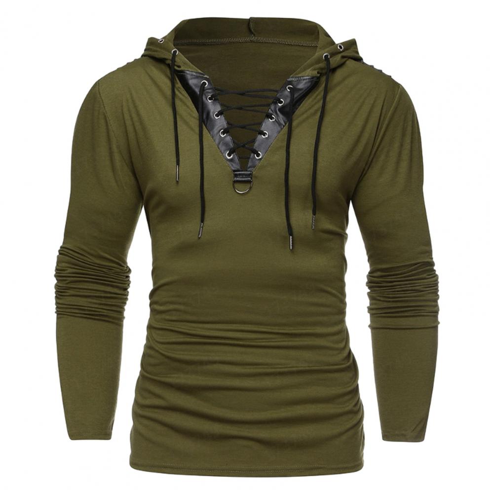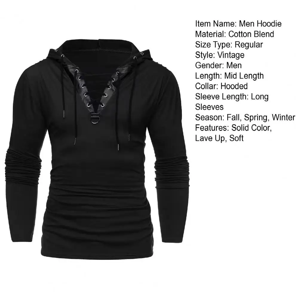 Men Spring Fall Hoodie Long Sleeve Strap Lace Up Pullover Soft Solid Color Vintage Solid Color Breathable Casual Men Winter Top