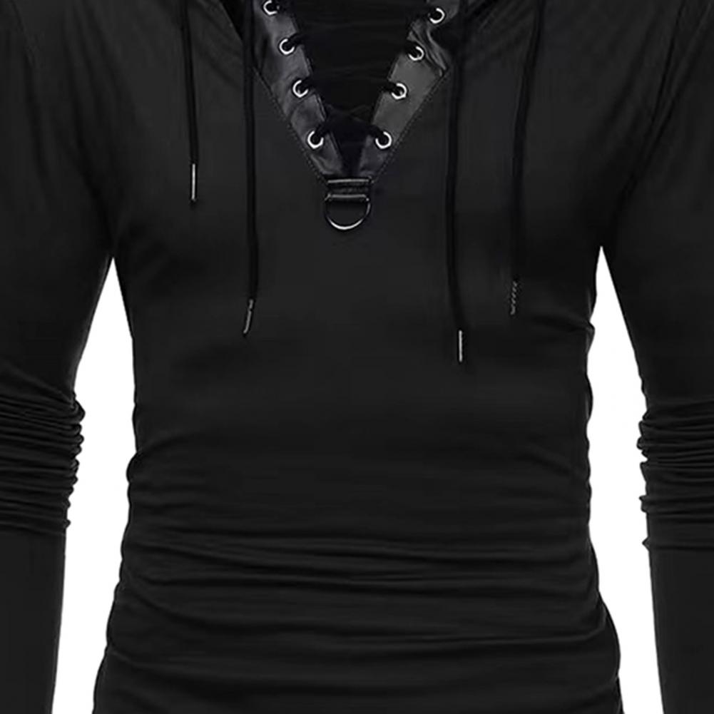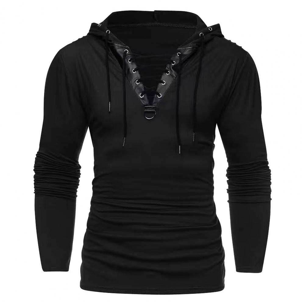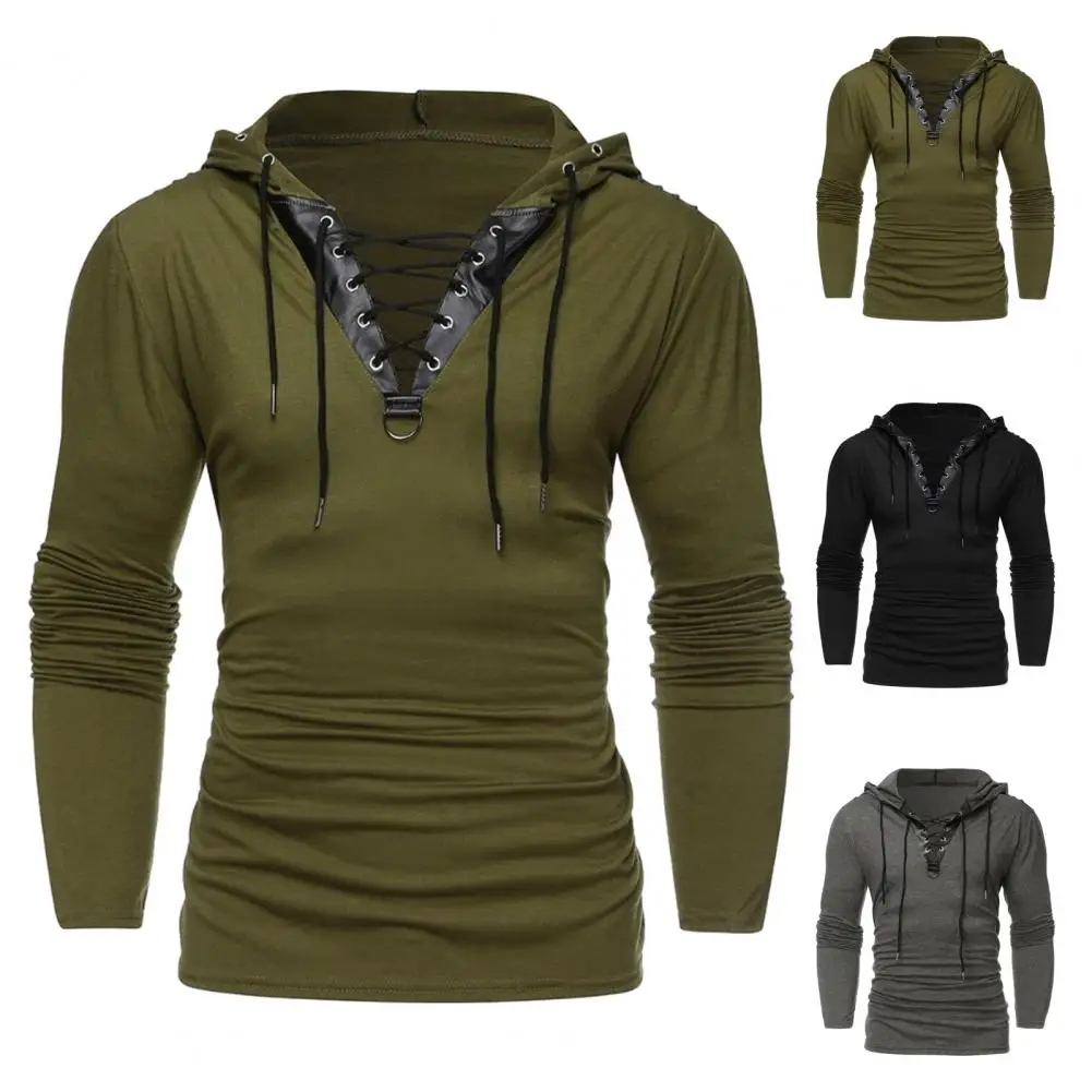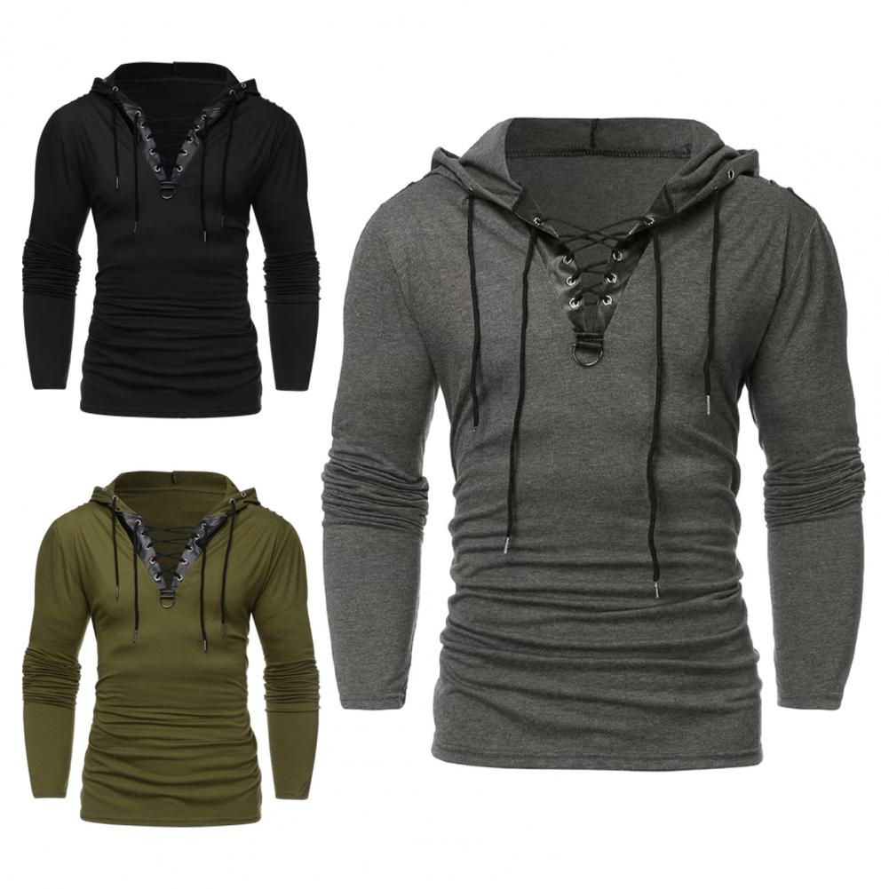 Men Spring Fall Hoodie Long Sleeve Strap Lace Up Pullover Soft Solid Color Vintage Solid Color Breathable Casual Men Winter Top