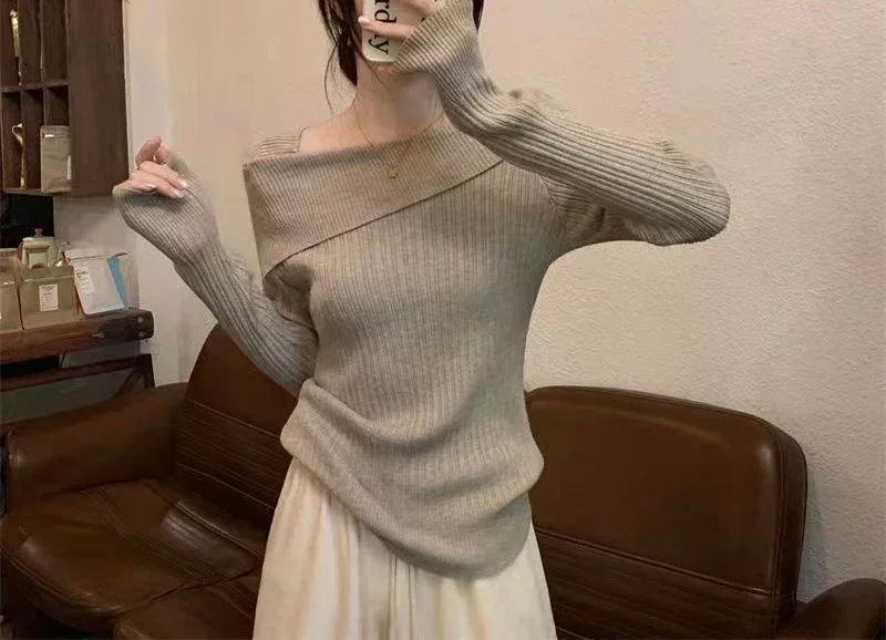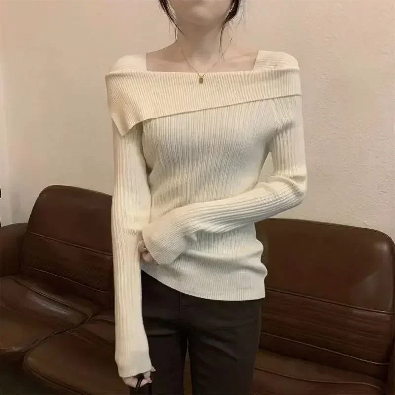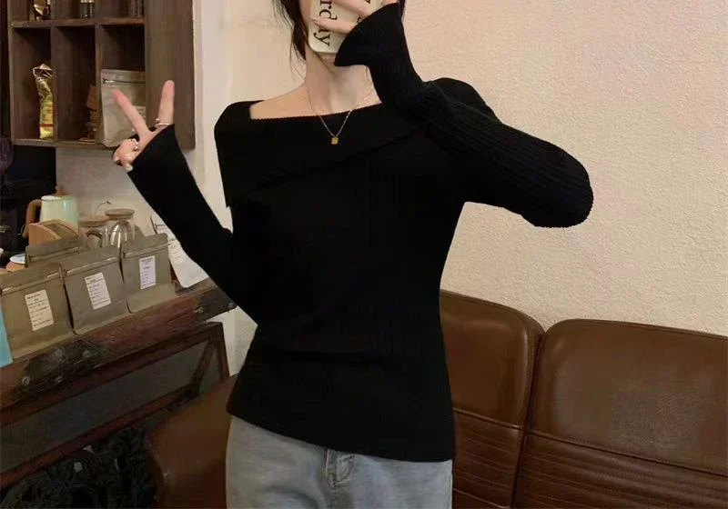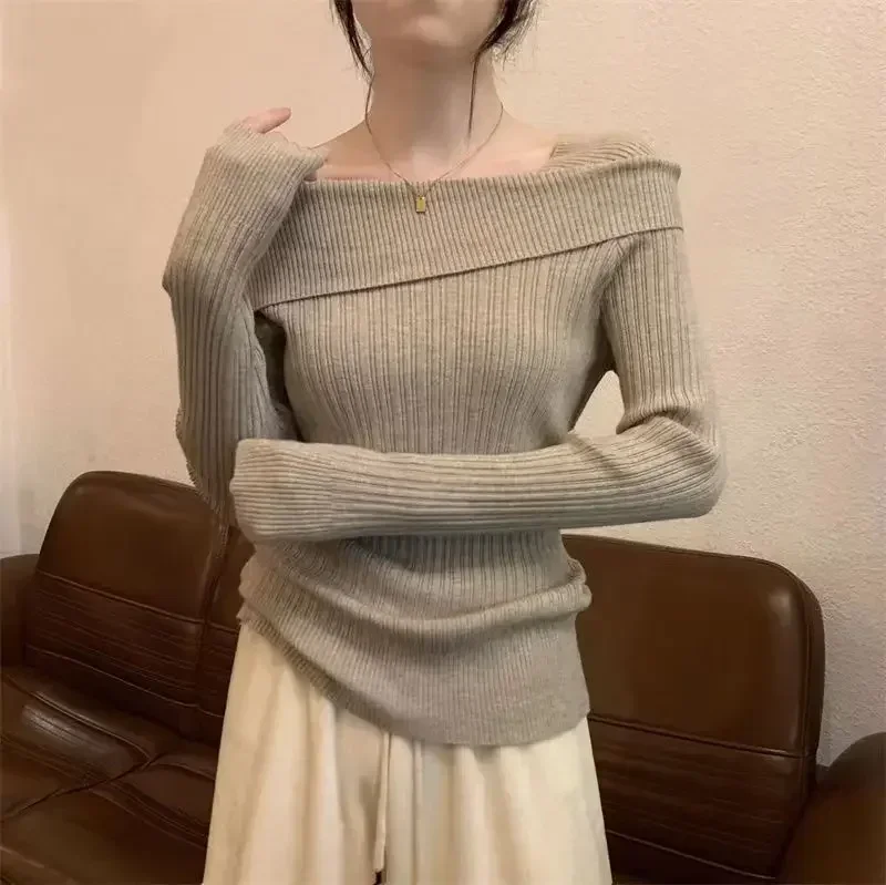 POCZCIY Women Slim Off Shoulder Knit Sweater Slash Neck Long Sleeve Knitwear Jumpers Office Sweater For Women 2024 Autumn Winter