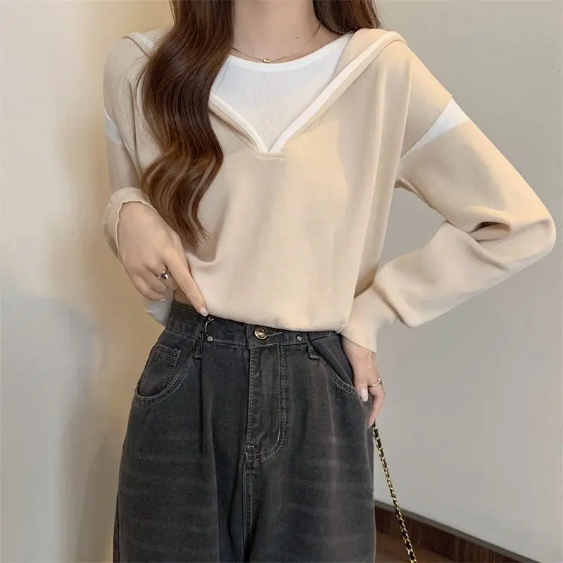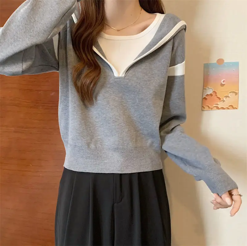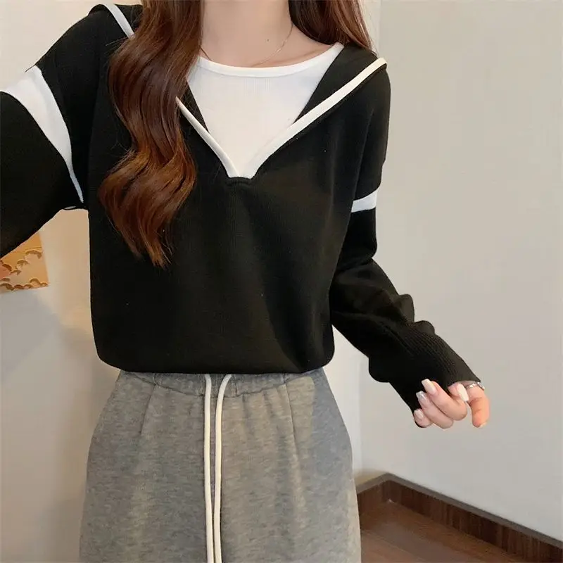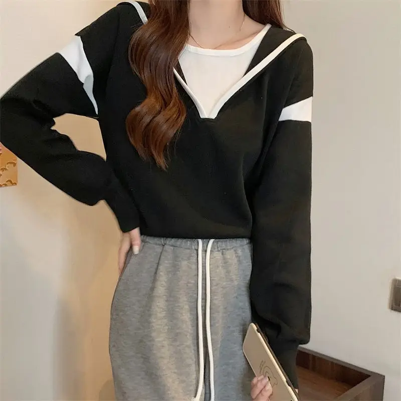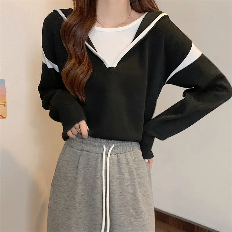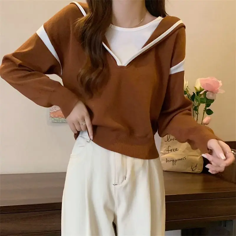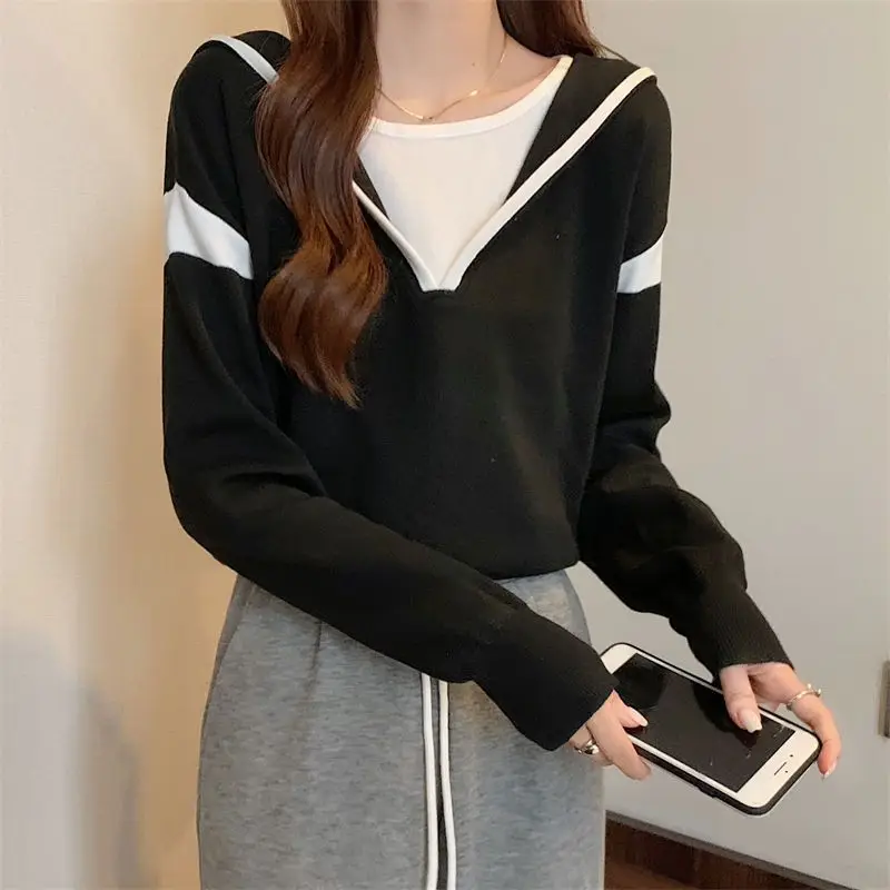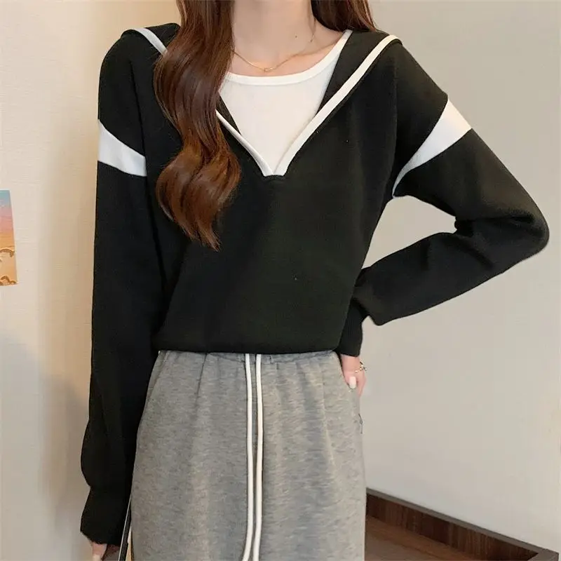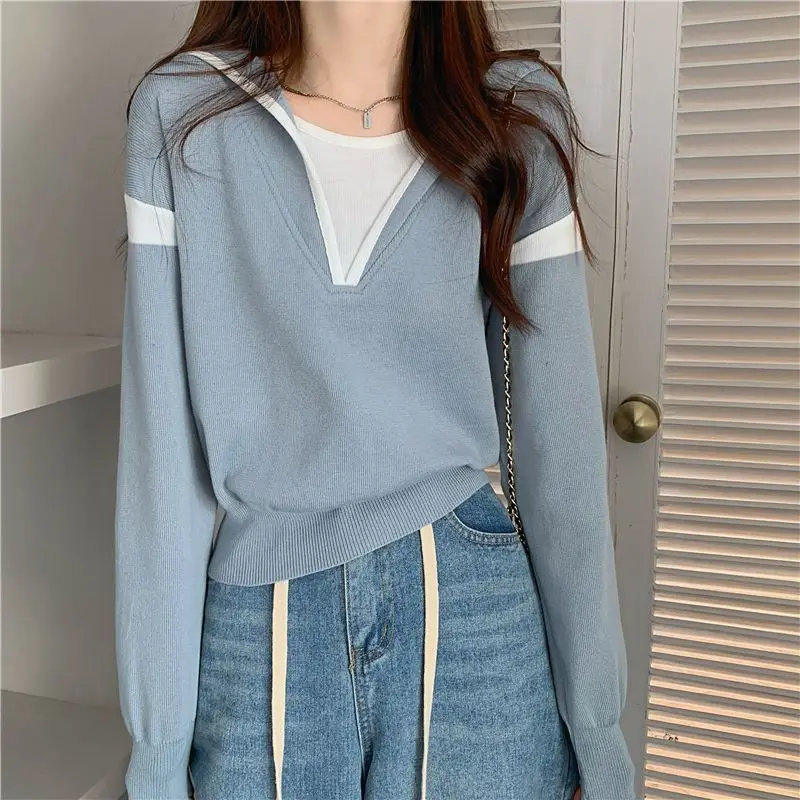 Spring Autumn New Fake Two Pieces Short Pullovers Top Long Sleeve Patchwork Loose Korean Sweaters Casual Fashion Women Clothing