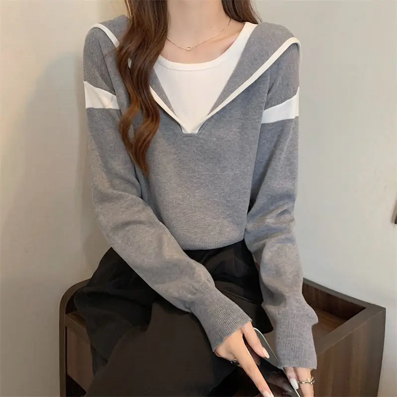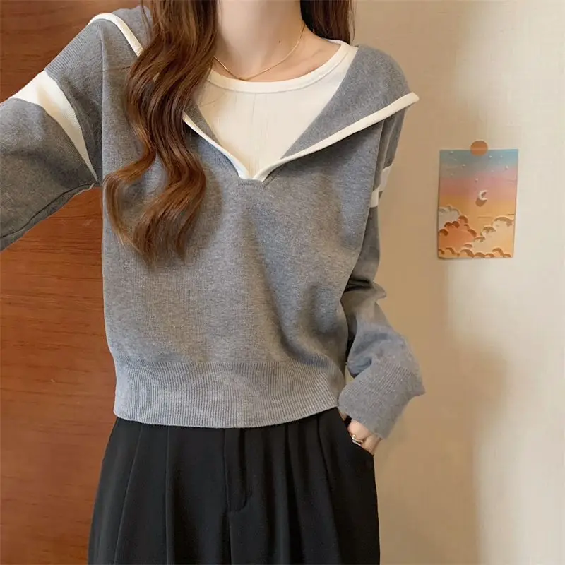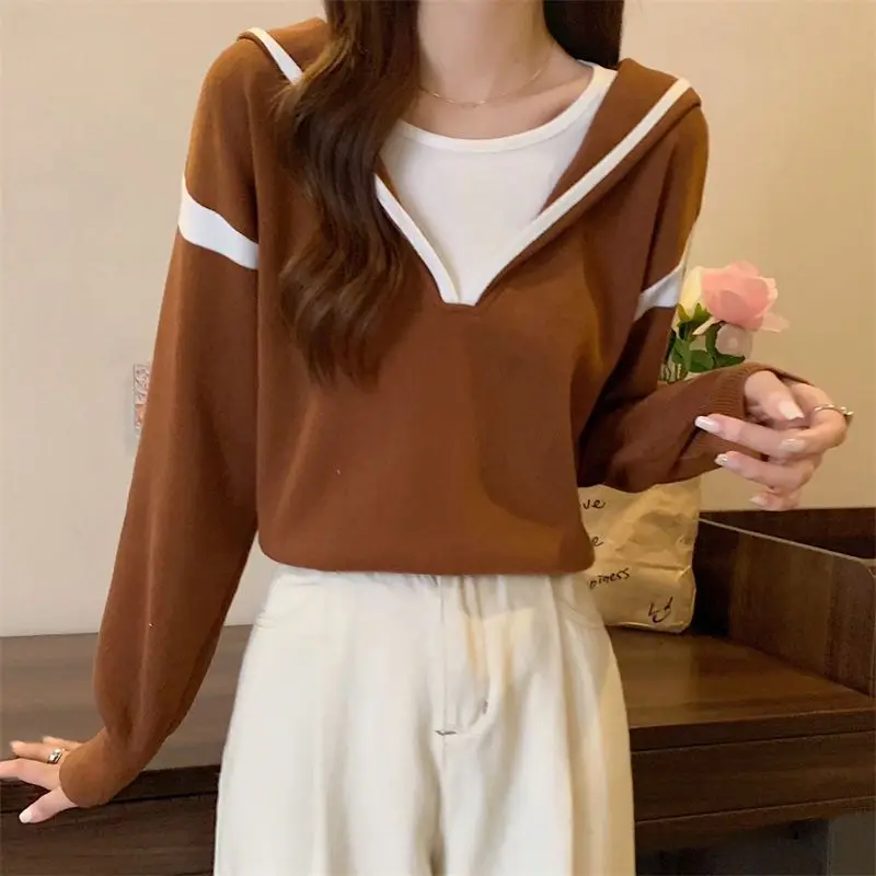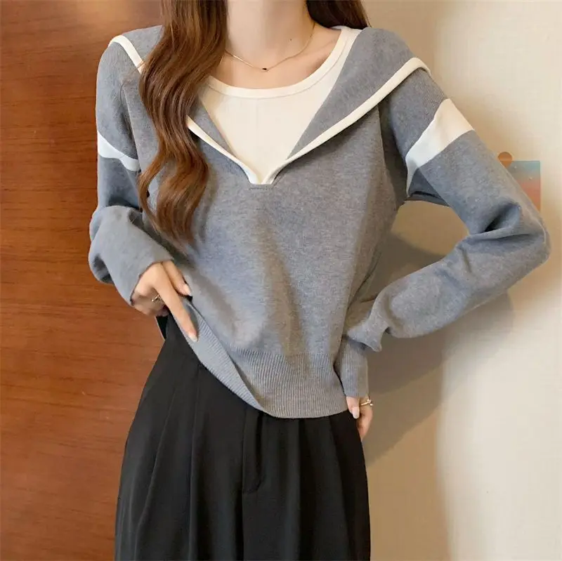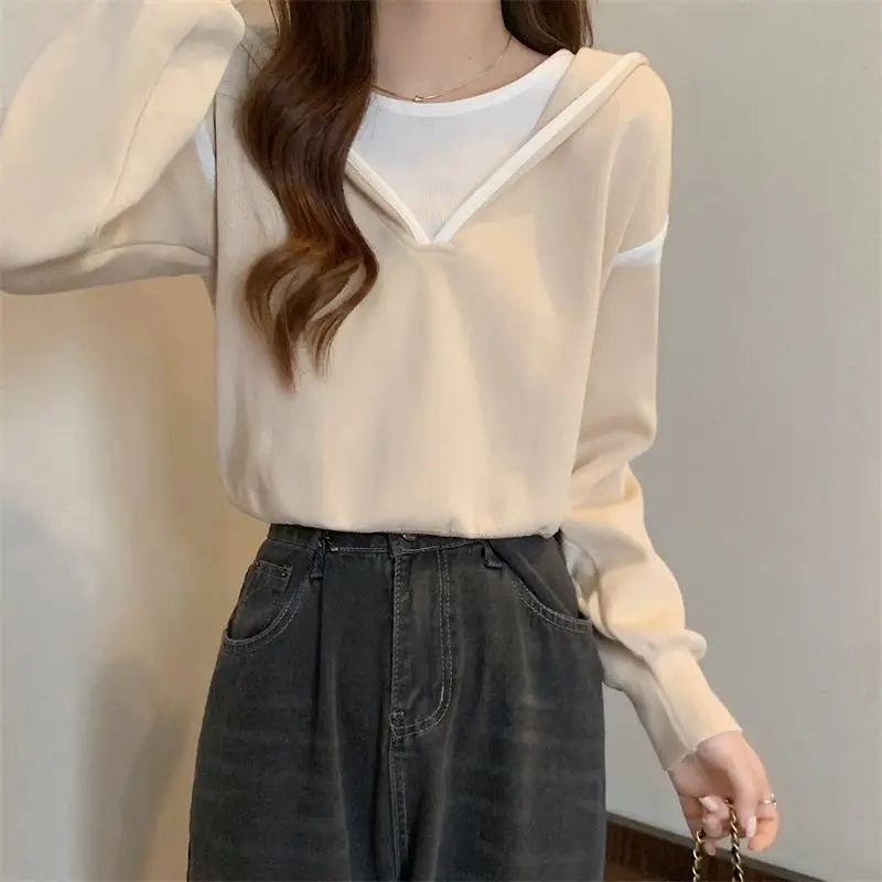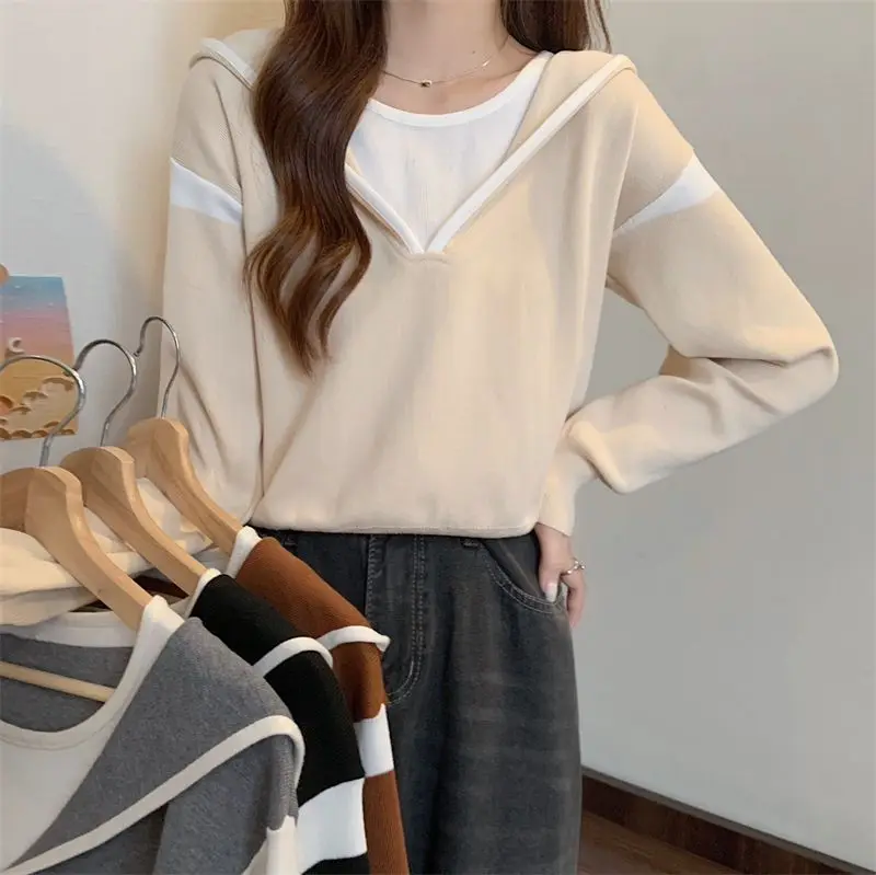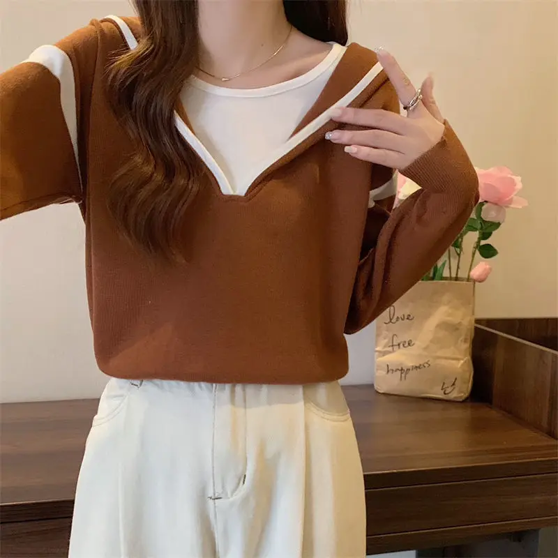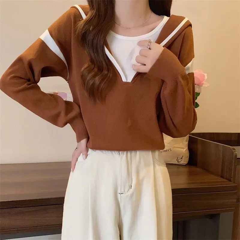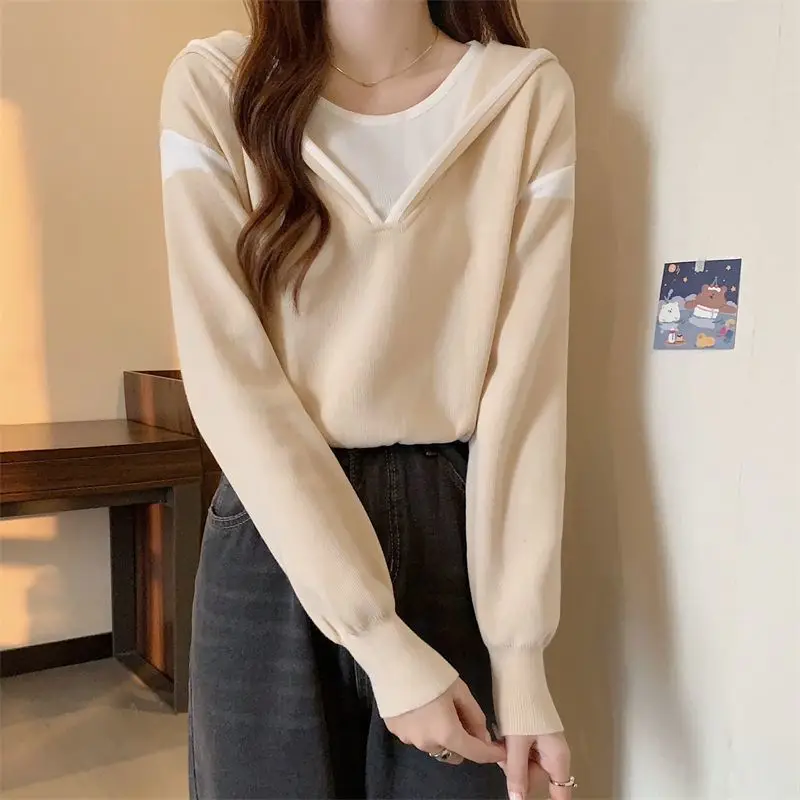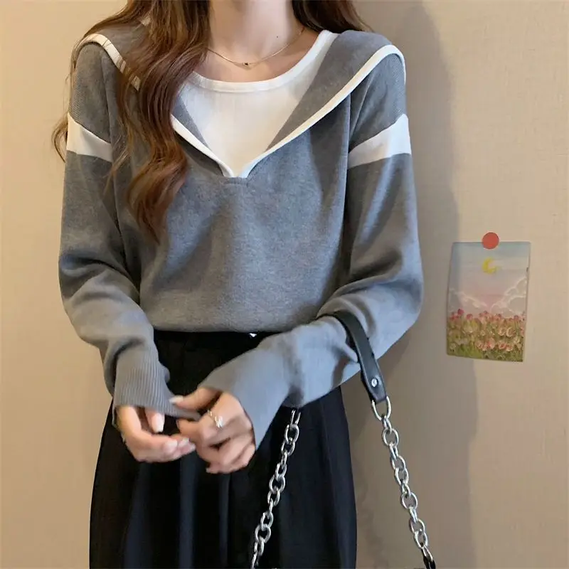 Spring Autumn New Fake Two Pieces Short Pullovers Top Long Sleeve Patchwork Loose Korean Sweaters Casual Fashion Women Clothing