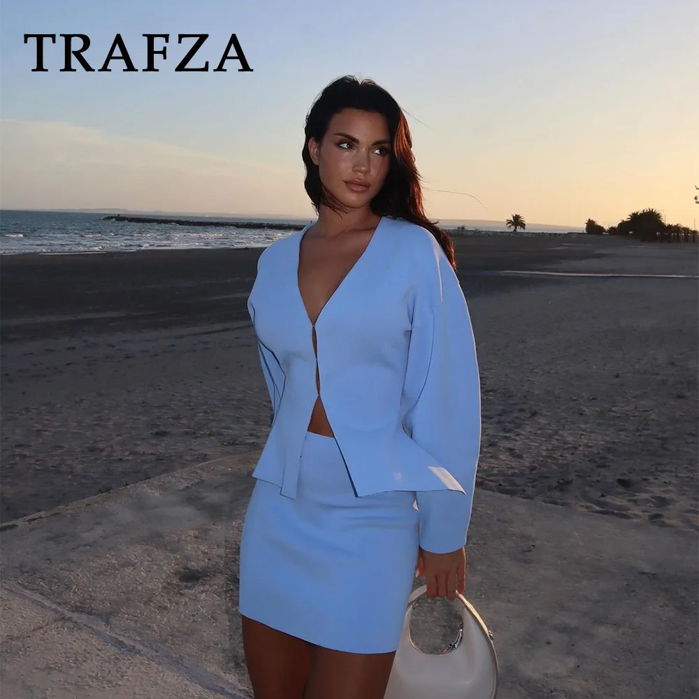 TRAFZA 2025 Spring Summer Sexy Solid Knitted Women Suits Fashion Nightclub V Neck Single Breasted Shirts+Chic Mini Pencil Skirts