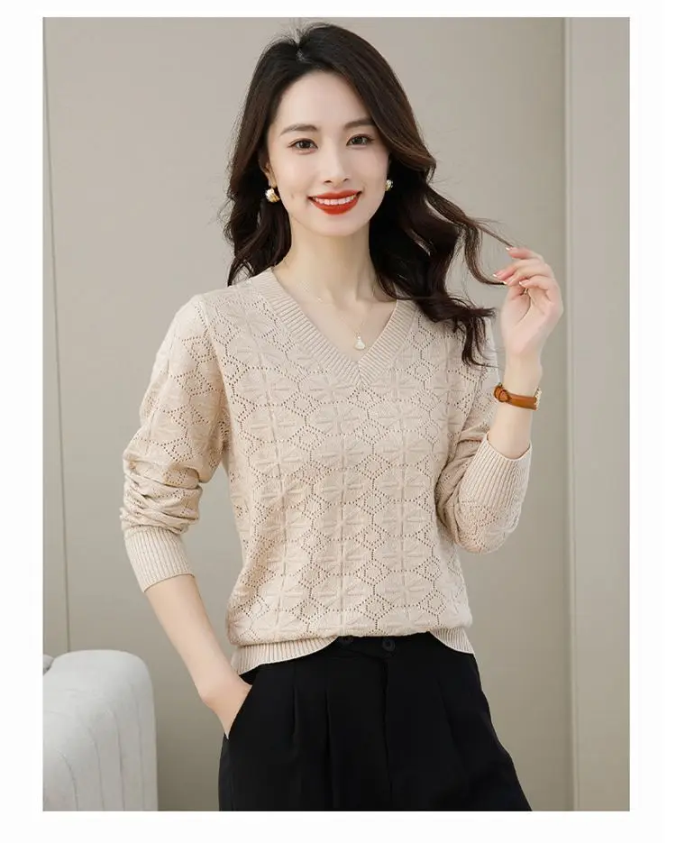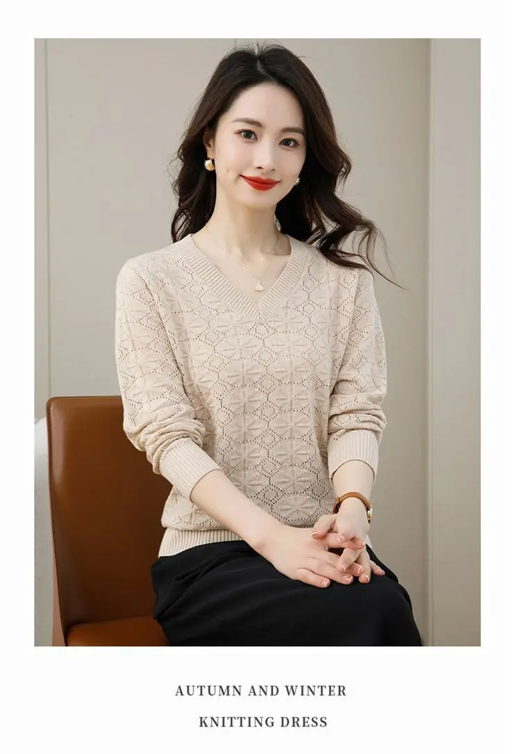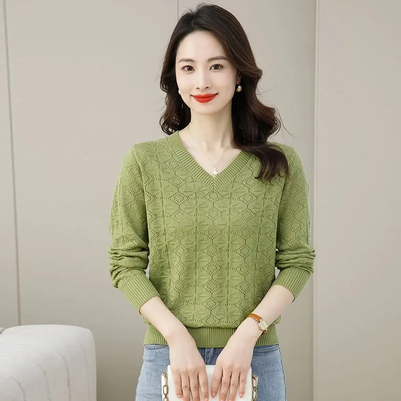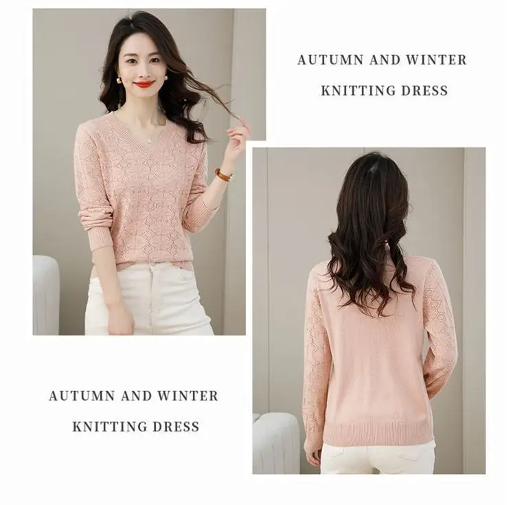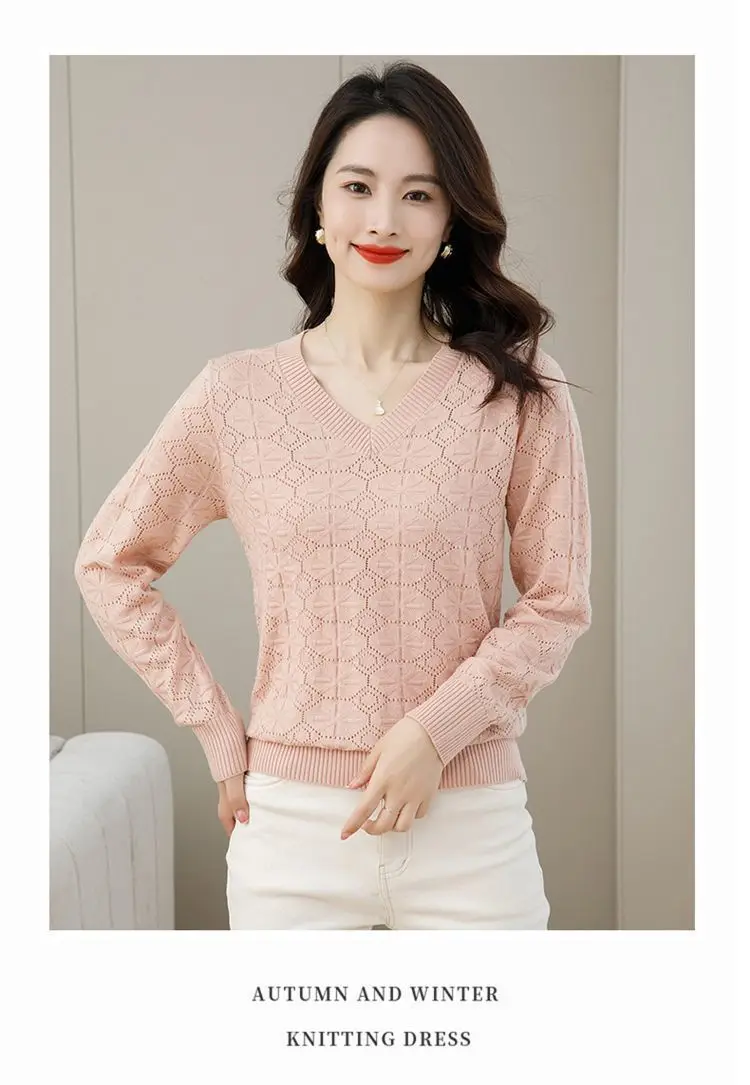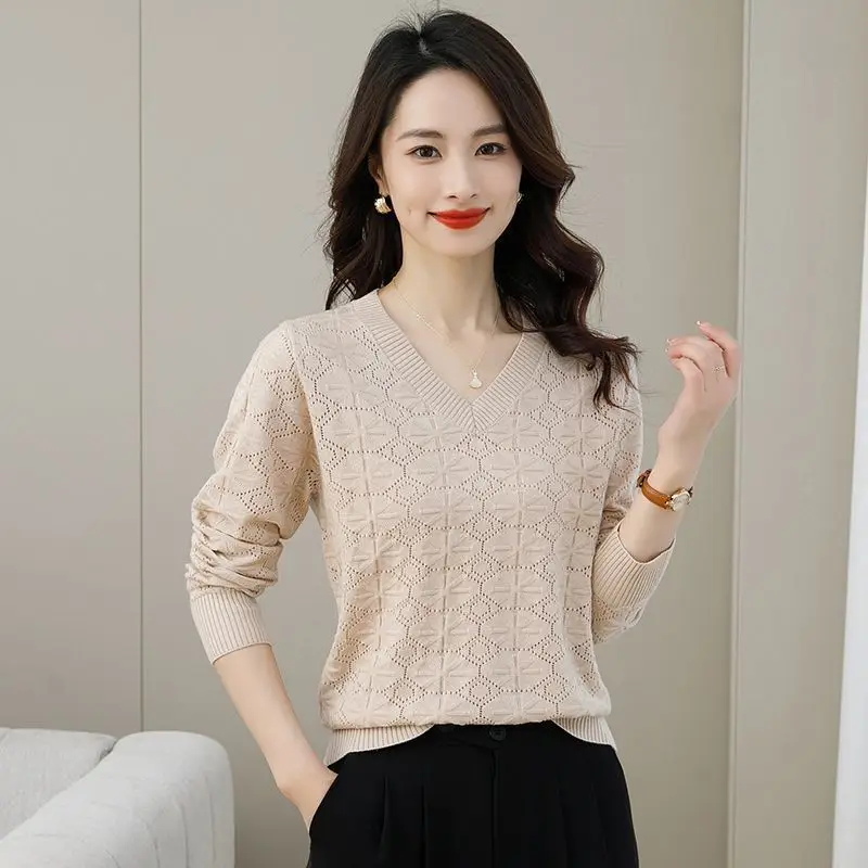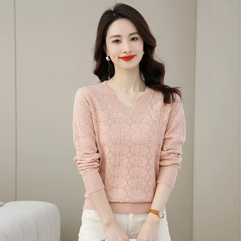 V-neck Hollow Out Knitting Bottoming Shirt Women Autumn Winter Simplicity Office Lady Sweater Casual All-match Knitwear Tops