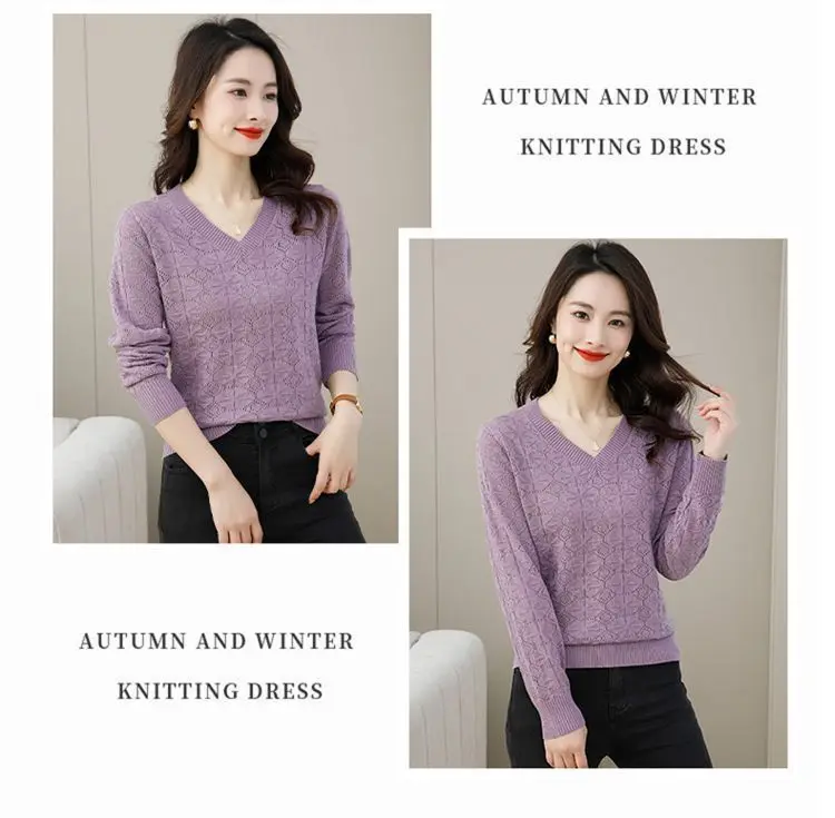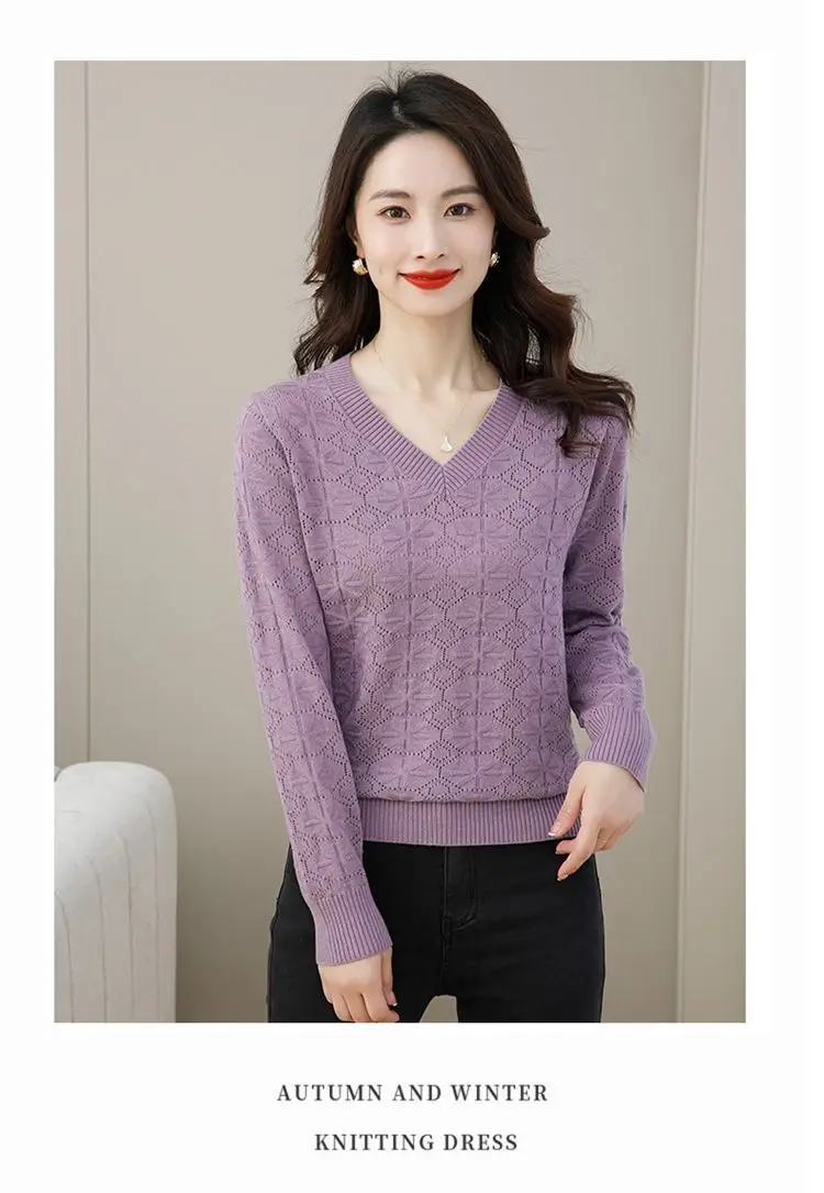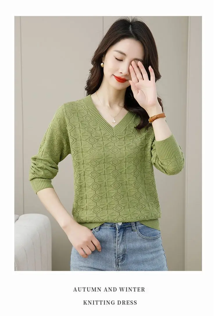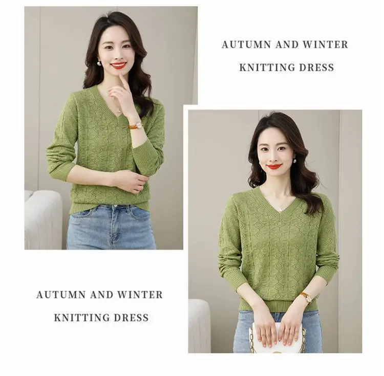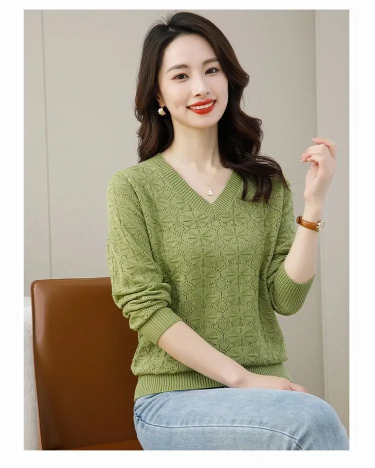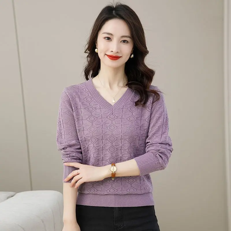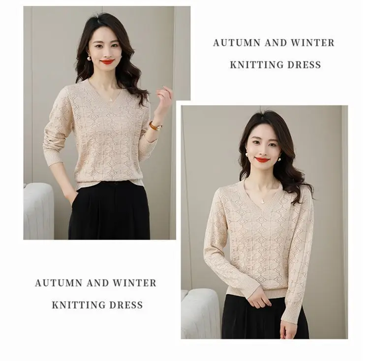 V-neck Hollow Out Knitting Bottoming Shirt Women Autumn Winter Simplicity Office Lady Sweater Casual All-match Knitwear Tops