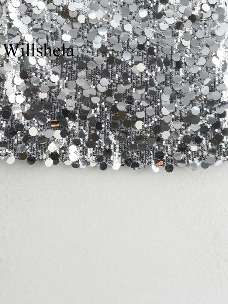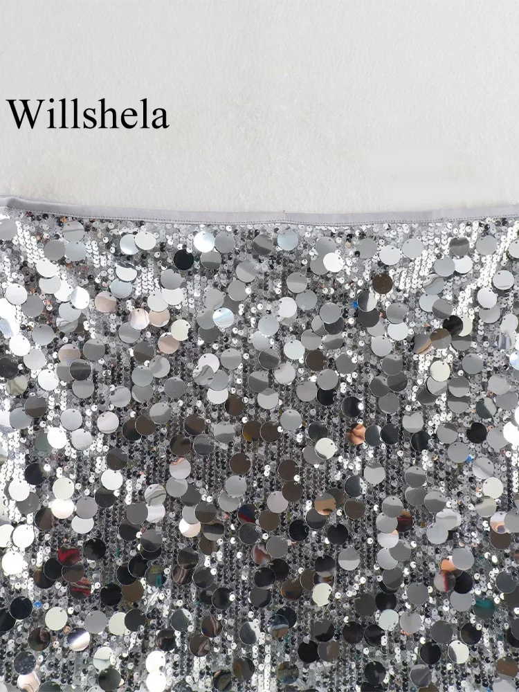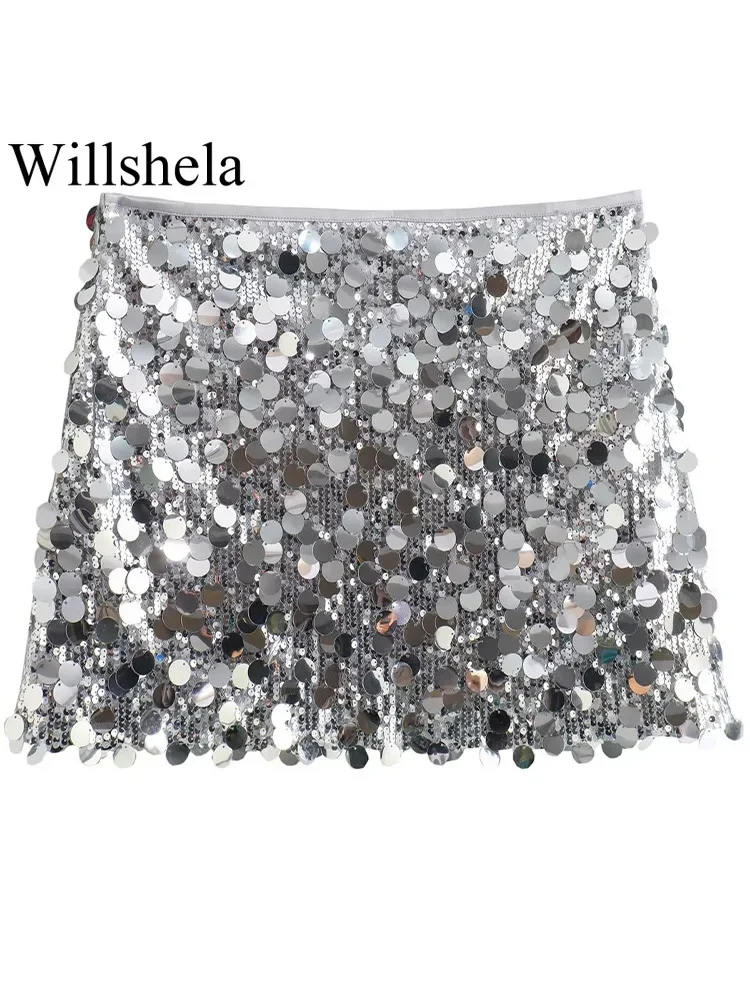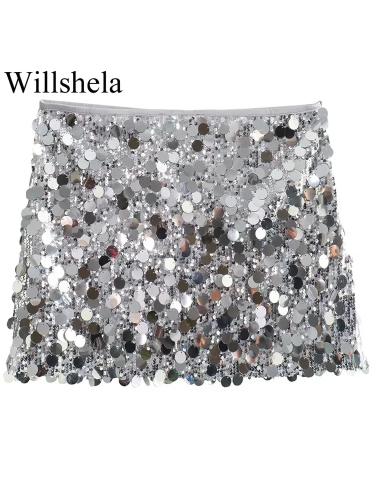 Willshela Women Fashion With Sequined Solid Side Zipper Mini Skirt Vintage High Waist Female Chic Lady Skirts