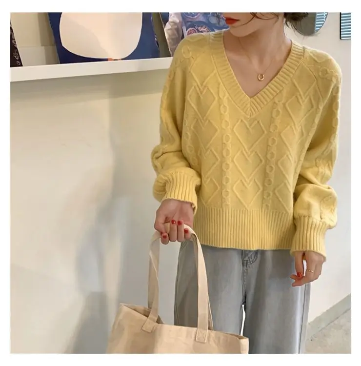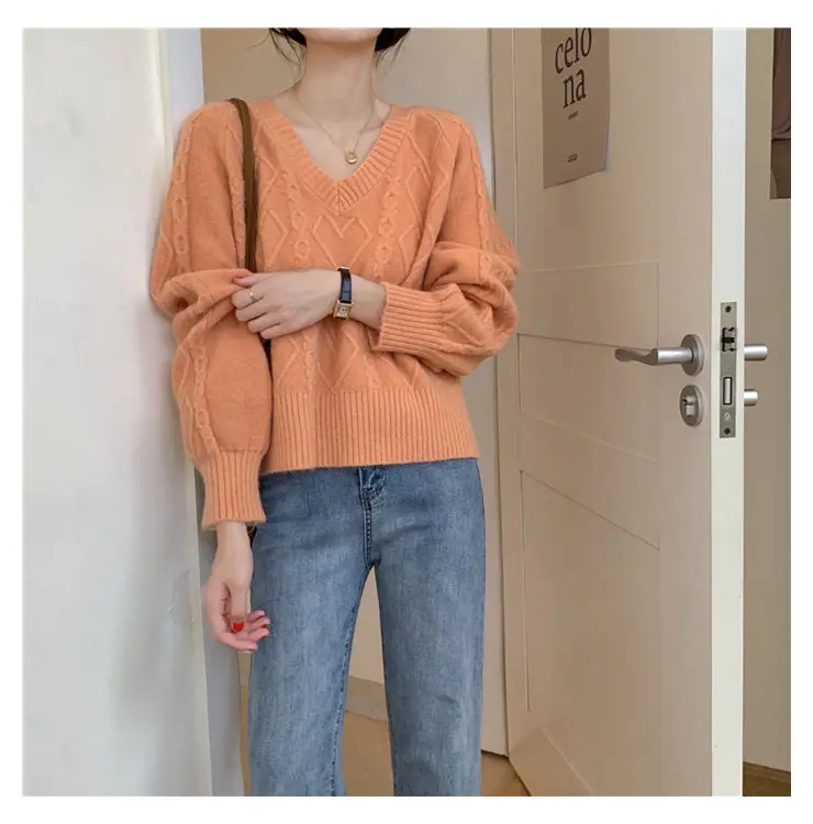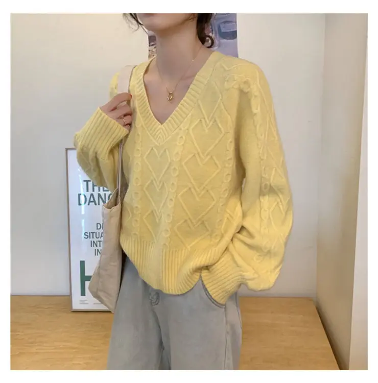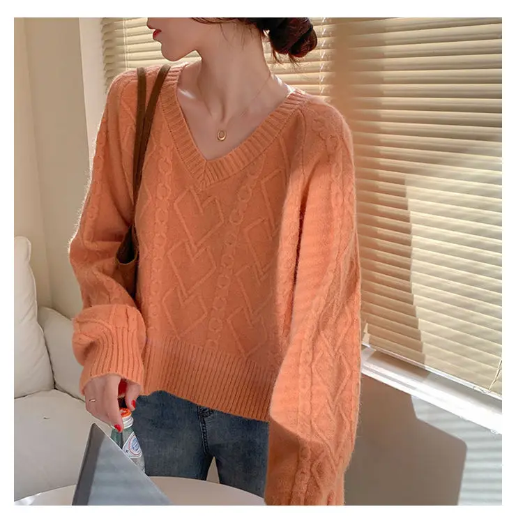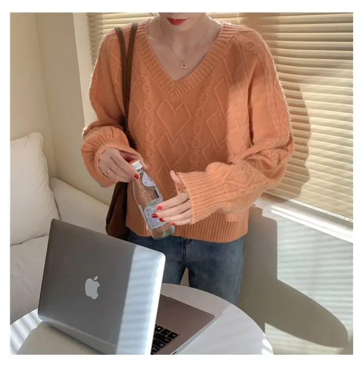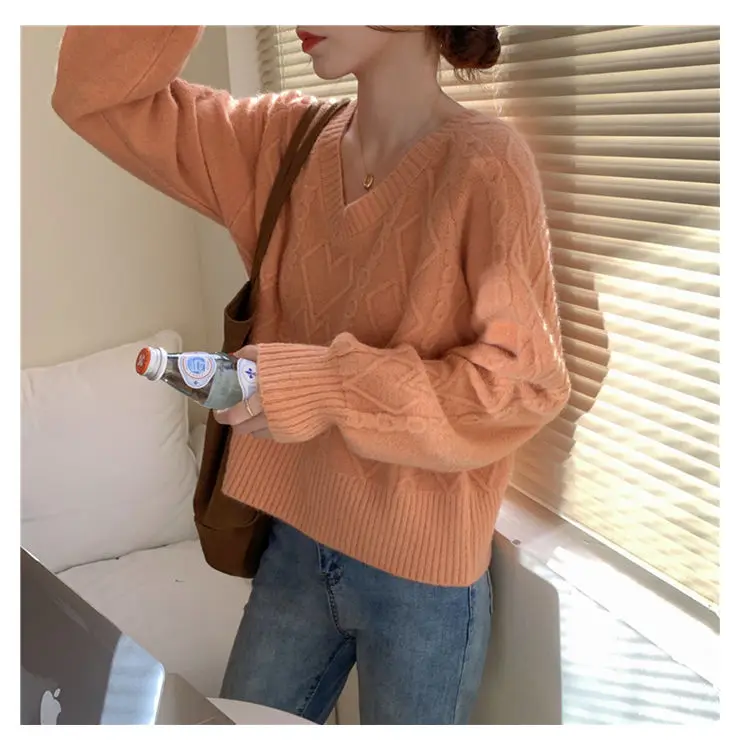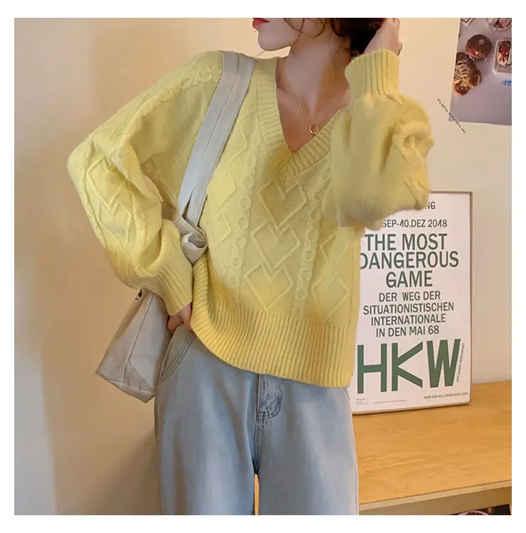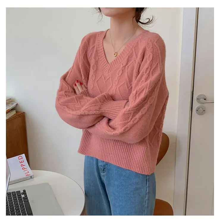 Women Autumn Winter Casual Screw Thread Solid Color Knitting Women Clothes All-match V-neck Loose Pullover Long Sleeve Sweater