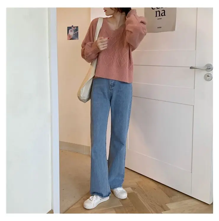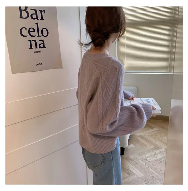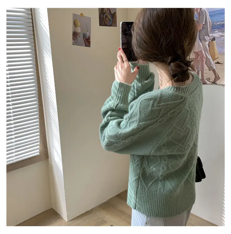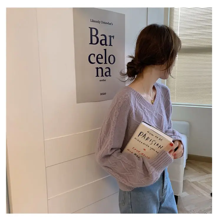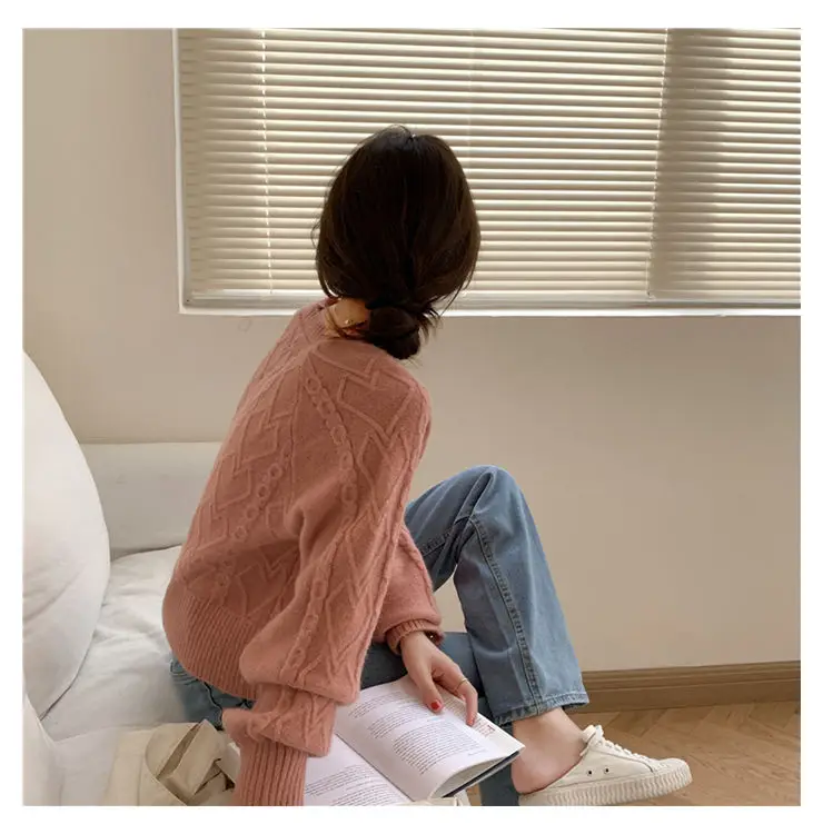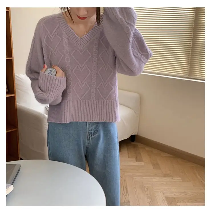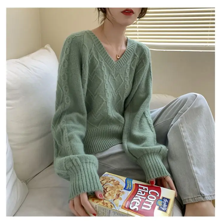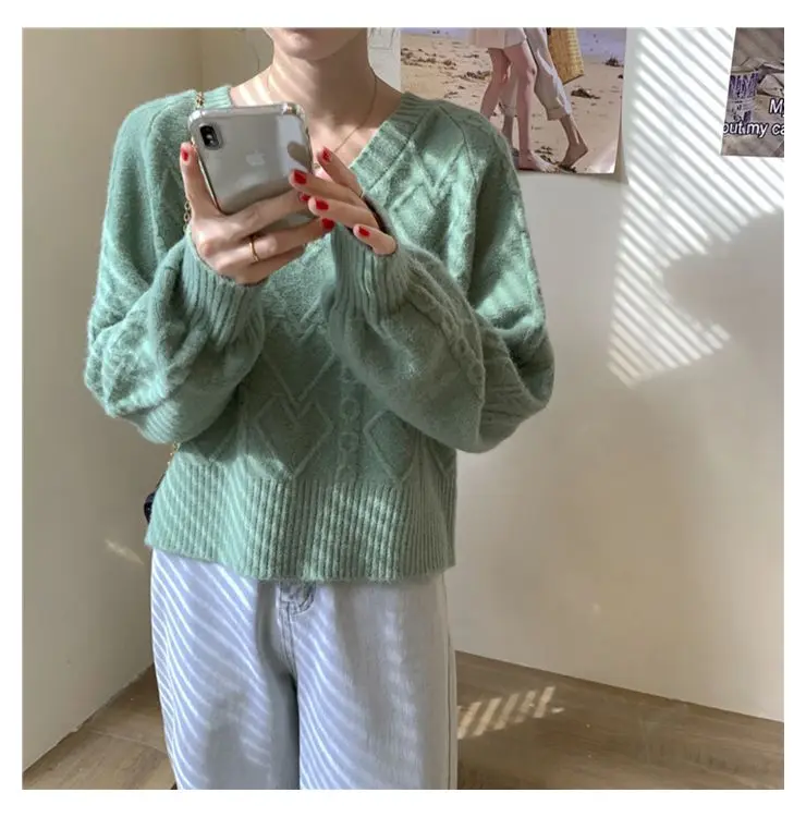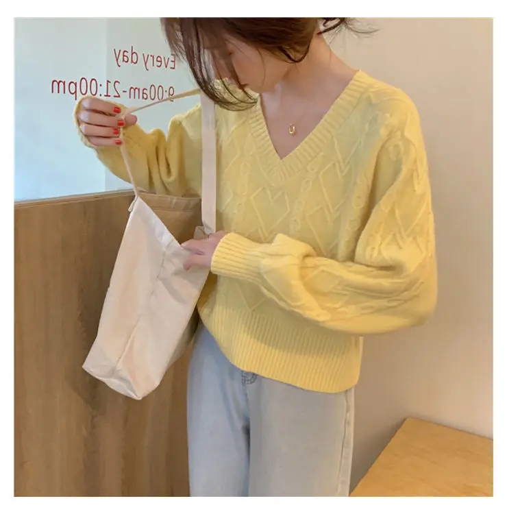 Women Autumn Winter Casual Screw Thread Solid Color Knitting Women Clothes All-match V-neck Loose Pullover Long Sleeve Sweater